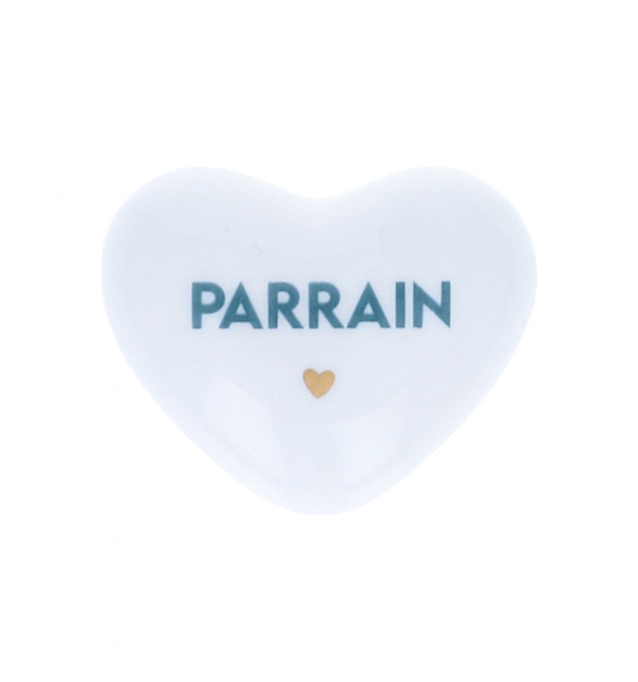 Craquez pour ce petit coeur en porcelaine avec le mot parrain écrit en bleu !