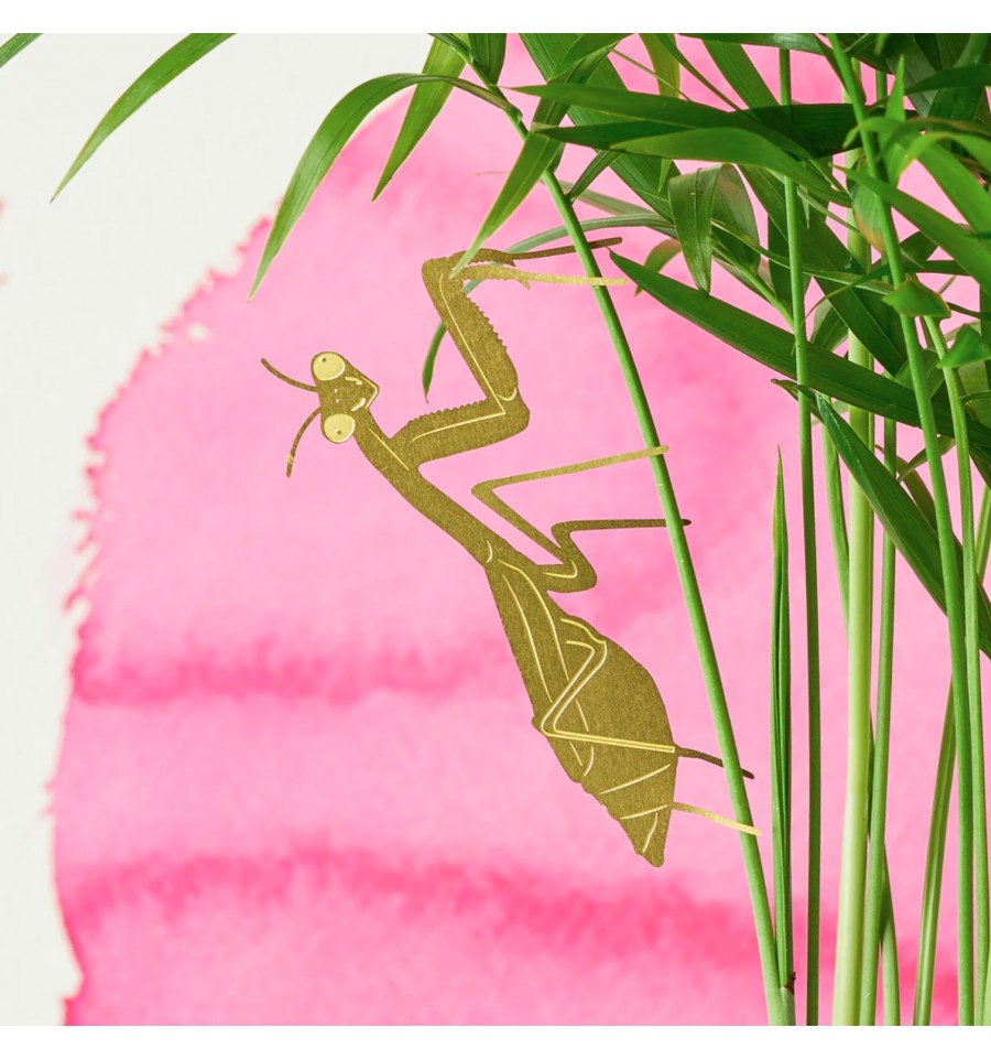 Voici la petite touche déco qu'il vous faut pour pimper l'ambiance de votre salon : cette décoration en laiton en forme de mante religieuse que vous pourrez fixer facilement à vos plantes.