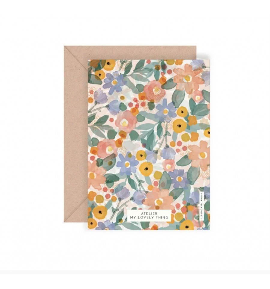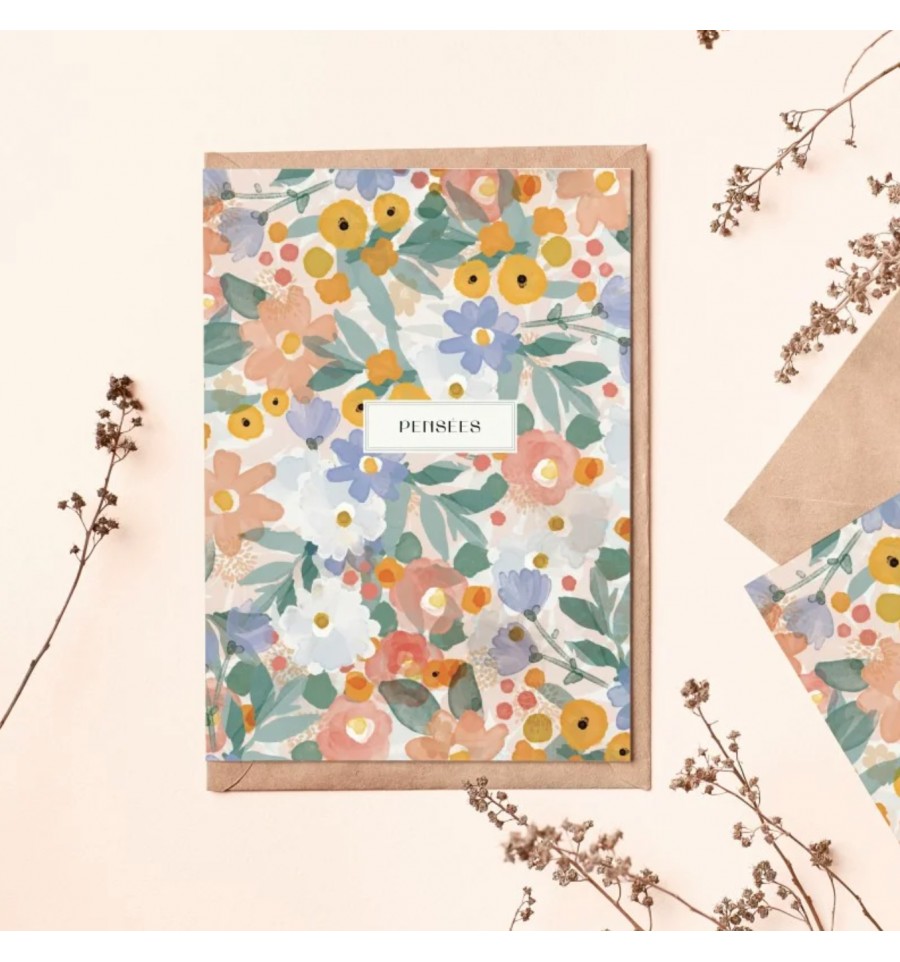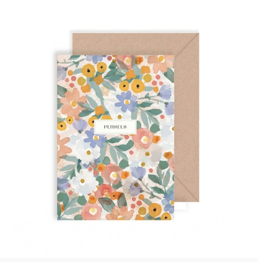 Originalité et douceur garantie avec cette carte très fleurie et colorée, avec le mot "Pensées"