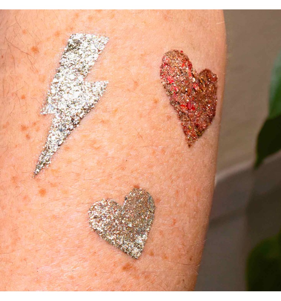 Décollez le modèle, appliquez sur la peau, pailletez, retirez le pochoir, et HOP c'est terminé !