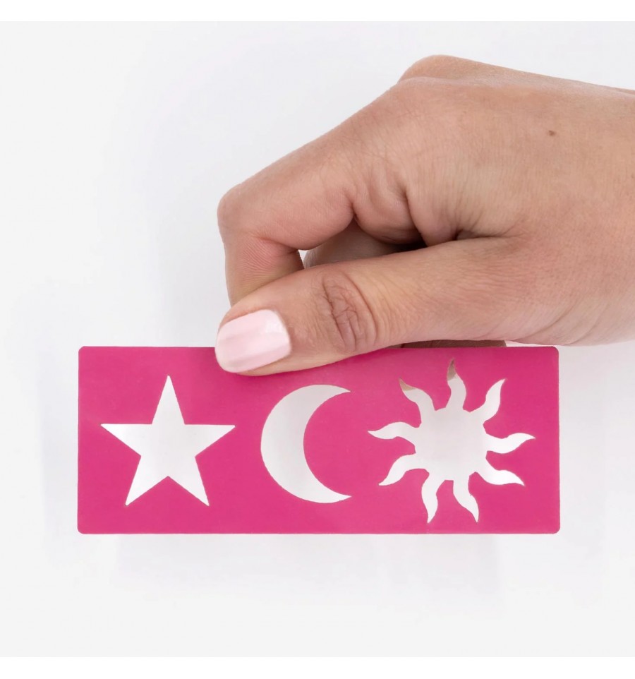 Grâce à ce pochoir cosmique (Etoile, lune et soleil), plus d'excuse pour maquiller comme une reine ! Facile à glisser dans son sac avec ses paillettes, amenez votre nécessaire partout avec vous, amusez-vous en scintillant de mille feux !