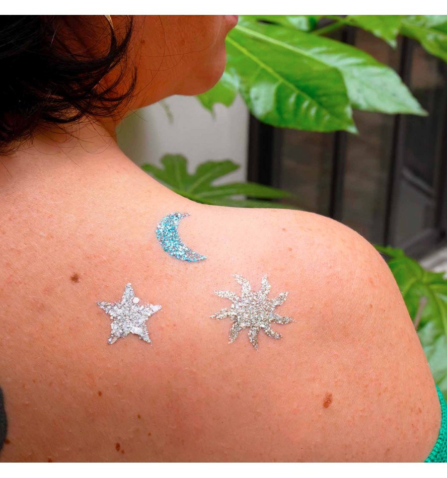 Décollez le modèle, appliquez sur la peau, pailletez, retirez le pochoir, et HOP c'est terminé !
