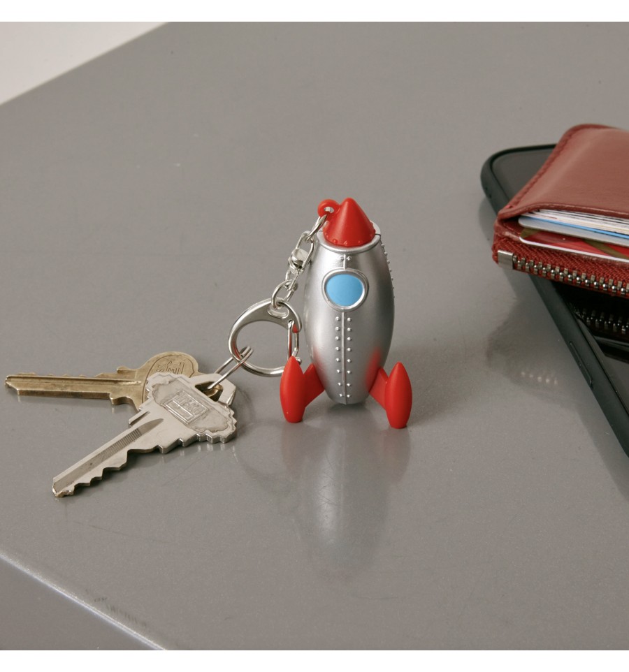 Cet porte-clés en forme de fusée fait du bruit lorsqu'on appuie sur le bouton. Prêt à partir dans l'espace ?!