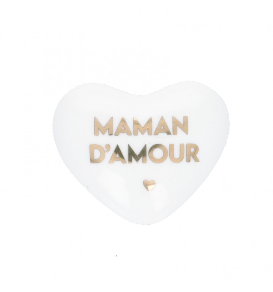 Un petit coeur en céramique blanche avec l'inscription Maman d'amour en lettre dorées.