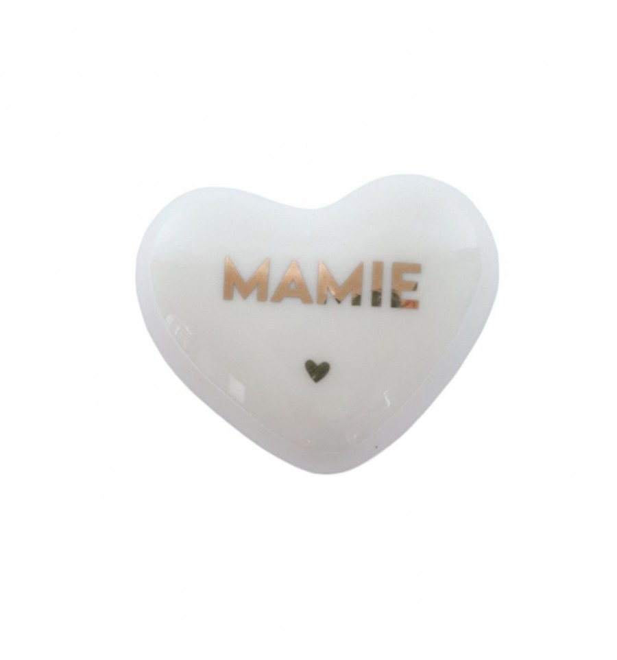 Un petit coeur en céramique blanche avec l'inscription "Mamie" en lettre dorées.