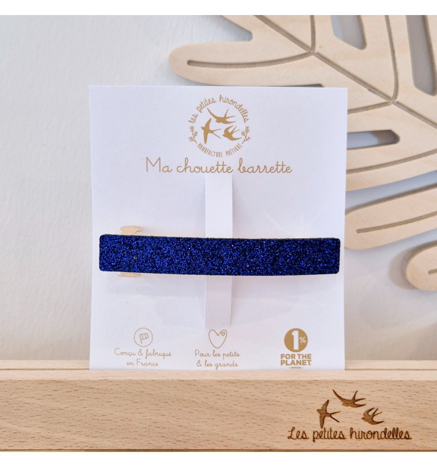 Cette jolie pince à cheveux pailletée bleue est signée Les Petites Hirondelles.
