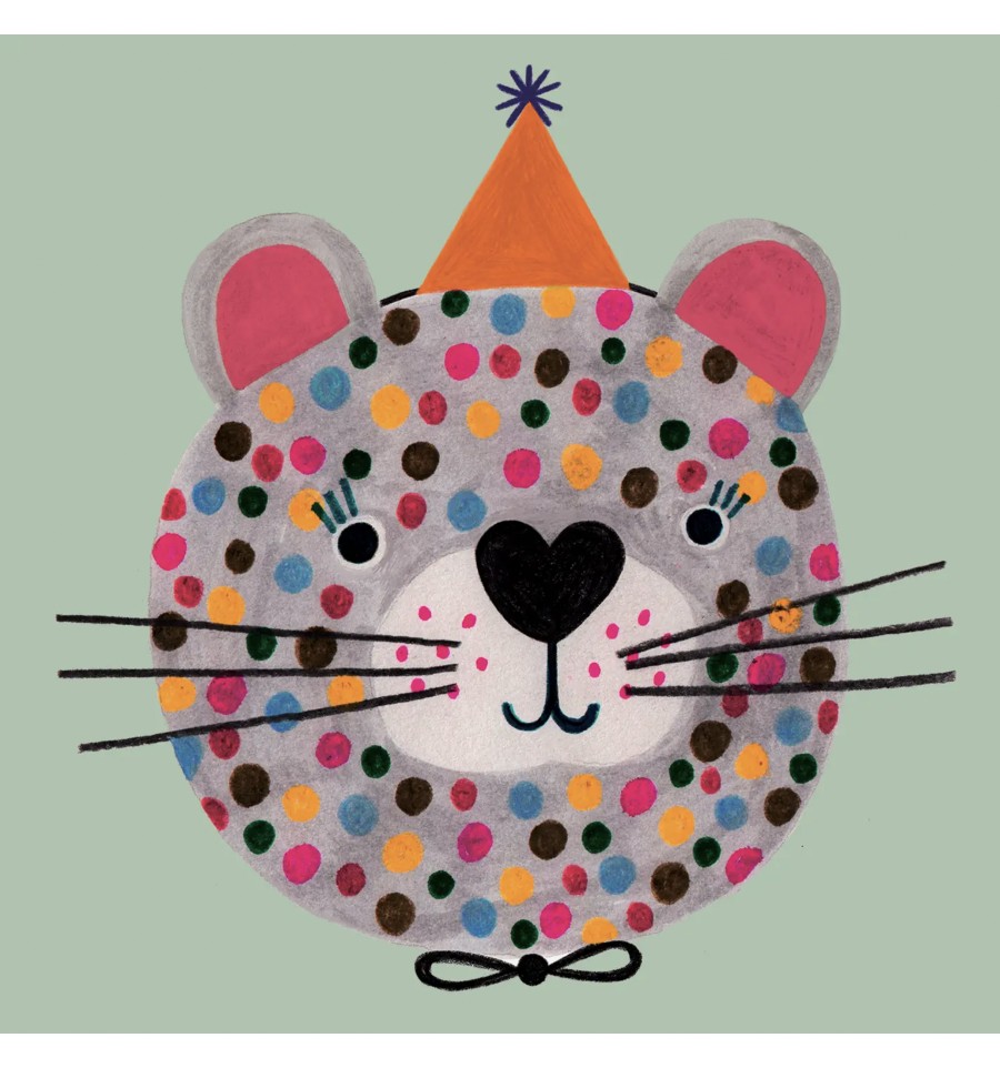 Cette carte double est fournie avec une enveloppe en kraft. Elle représente un adorable guépard recouvert de pois colorés et coiffé d'un chapeau orange vif.