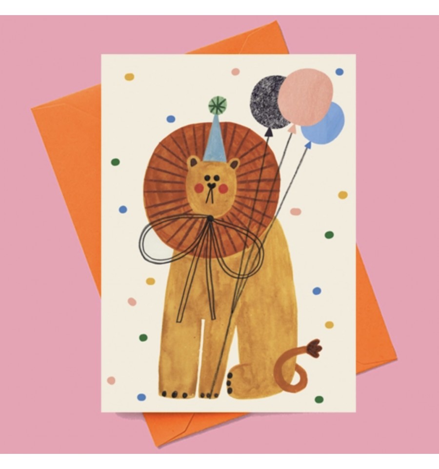Découvrez une carte tendre et festive à la fois ! Un lion, avec son chapeau de fête, tient entre ses pattes 3 ballons de baudruche.