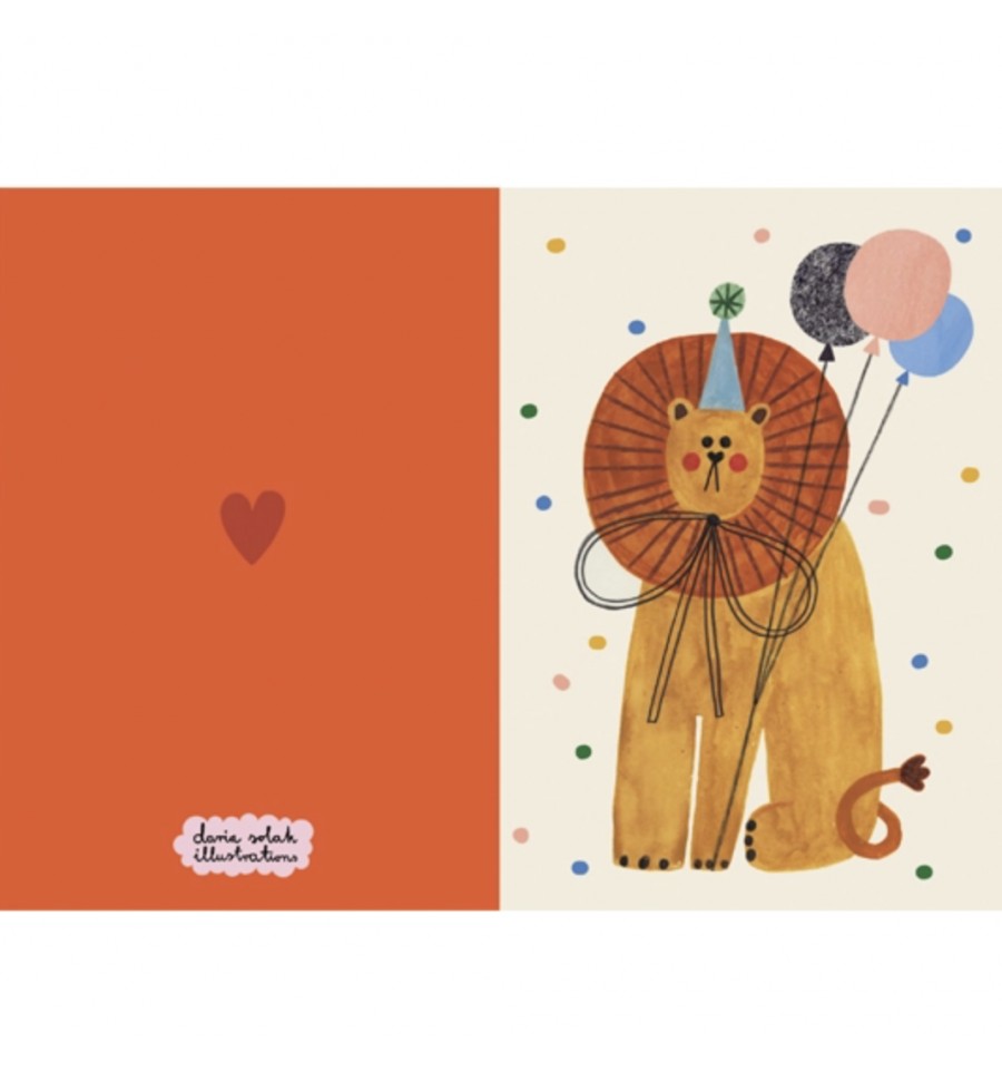 Cette carte double est fournie avec une enveloppe kraft. Dessus est dessiné un lion coiffé d'un chapeau et portant des ballons.
