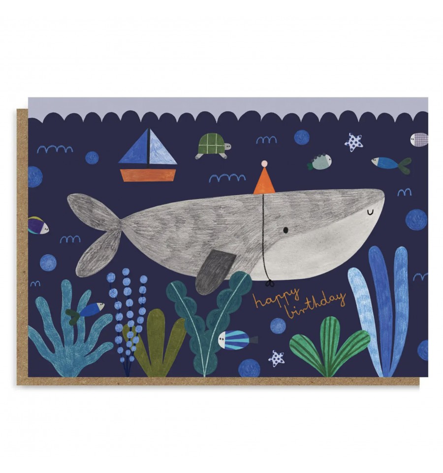 Découvrez une carte tendre et festive à la fois ! Une baleine et son chapeau de fête, déambule dans les fonds marins.