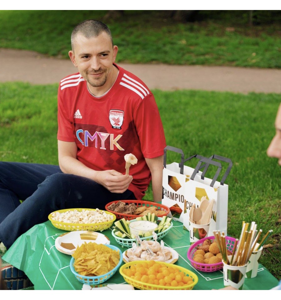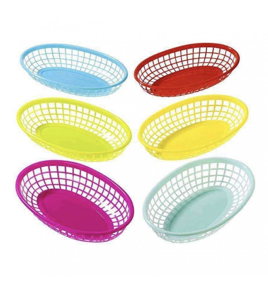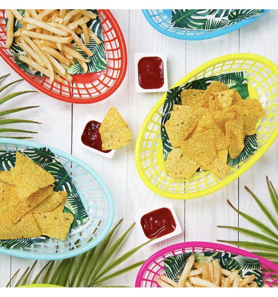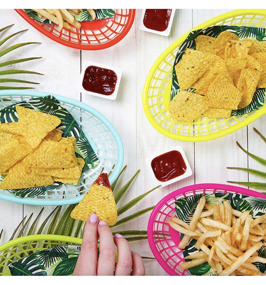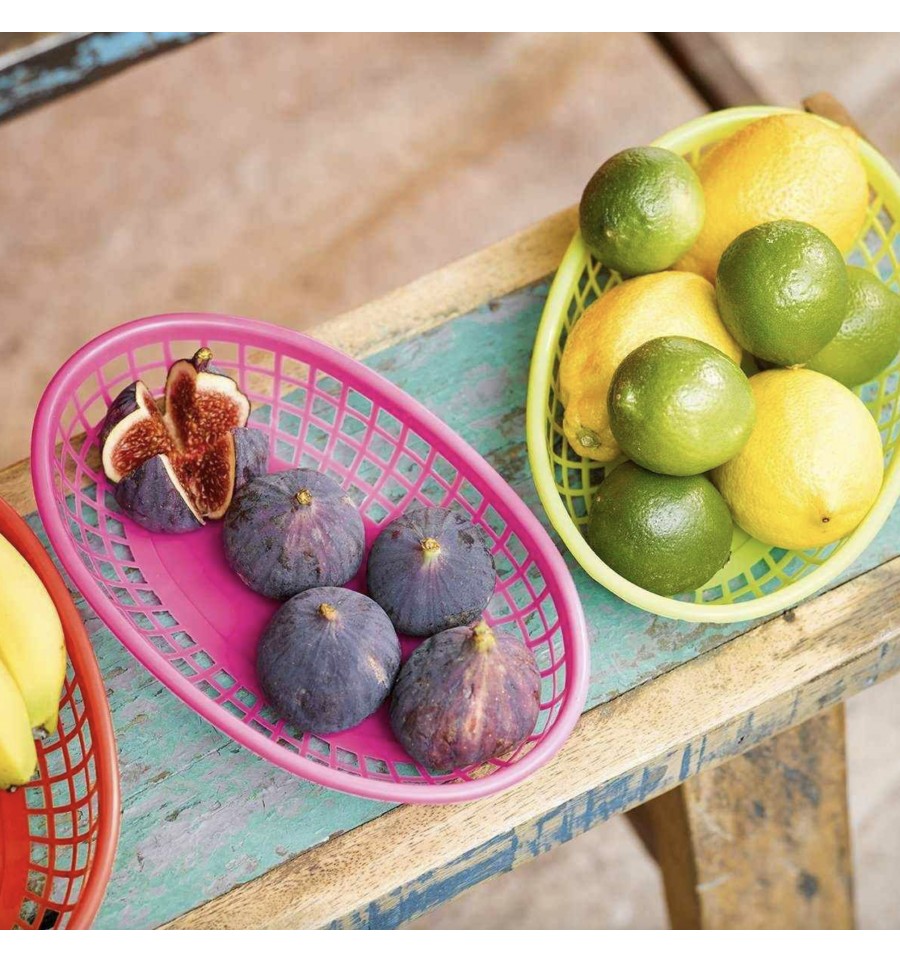 Corbeilles en plastique de couleurs : jaune, rose, vert anis, turquoise, bleu et rouge, imaginées par Talking Tables.