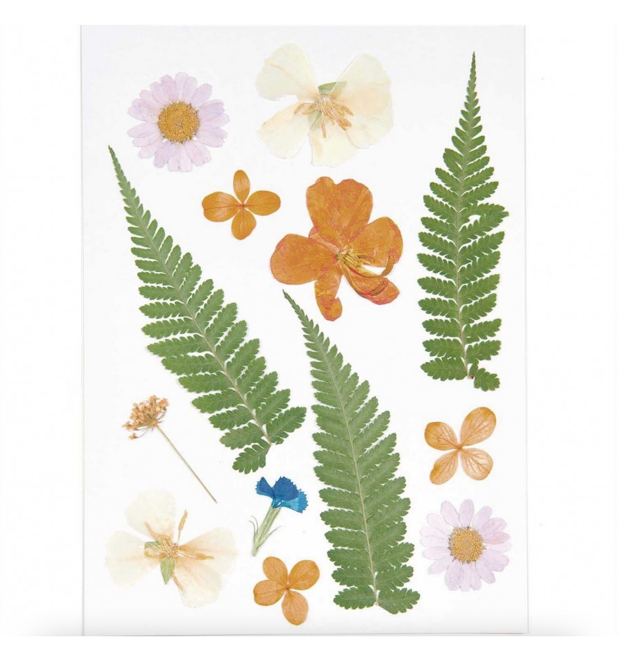 Rico Design propose ce set de 13 fleurs pressées dans des tonalités de vert et d'orange, avec de grandes fougères.