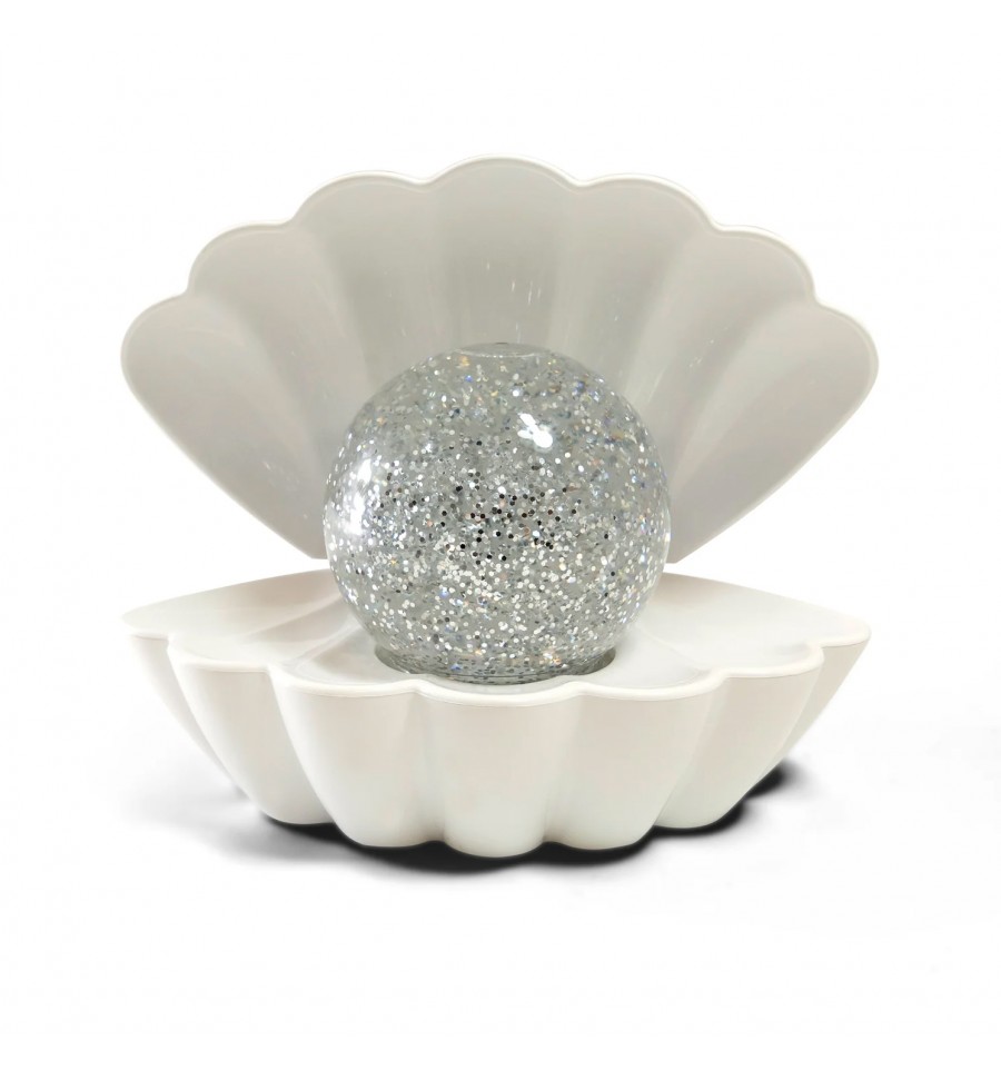 D'une coquille blanche brillante elle saura vous émerveiller, une fois allumée, la lumière dans la perle change de couleur progressivement et les paillettes à l'intérieur bougent et se mettent à tournoyer.