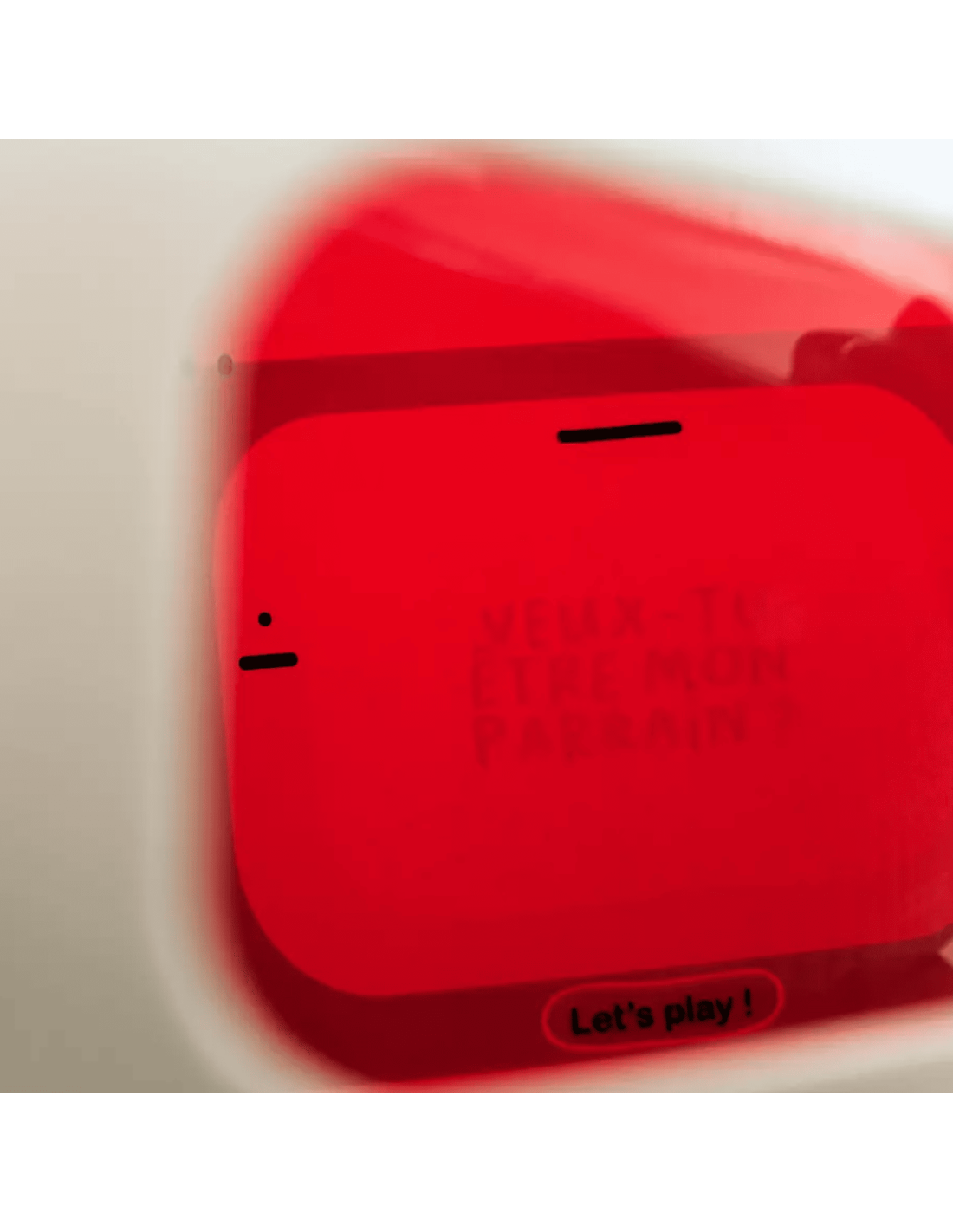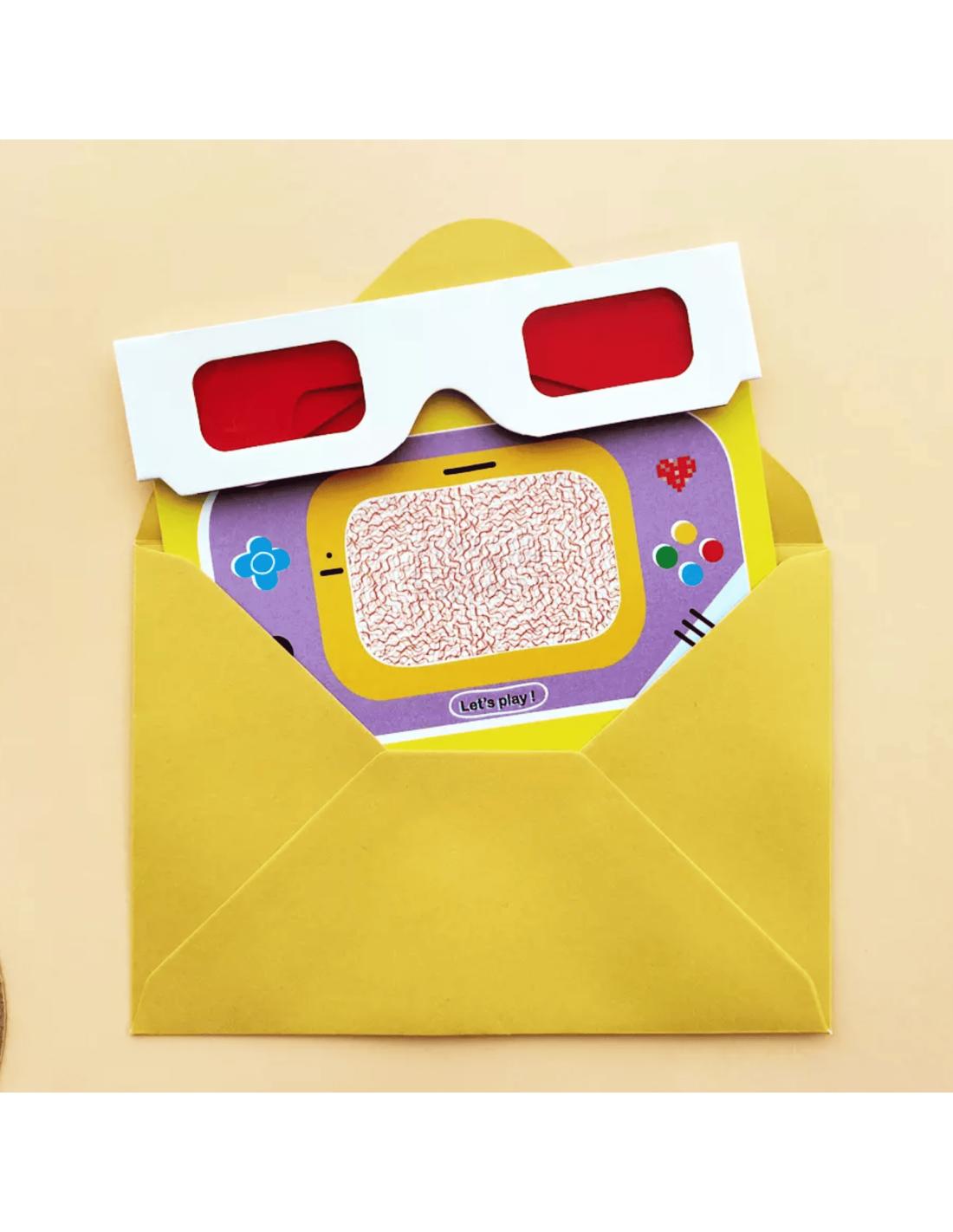 Sur cette carte façon "game boy", est caché un message qui ne pourra être révélé qu'avec des lunettes filtrantes fournies.