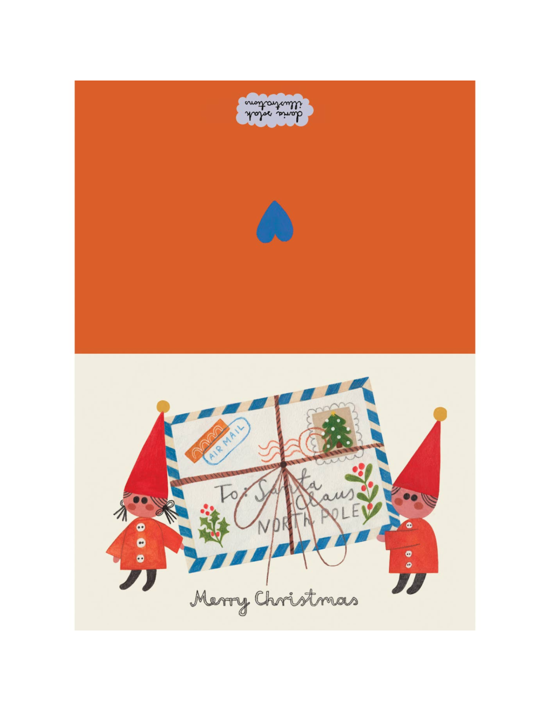 Cette carte double est fournie avec une enveloppe blanche. Deux petits elfes (une et un) qui tiennent fièrement une enveloppe cachetée pour : "Santa Claus - North Pole", en bas de la carte il y a l'inscription :"Merry Christmas". On adore !