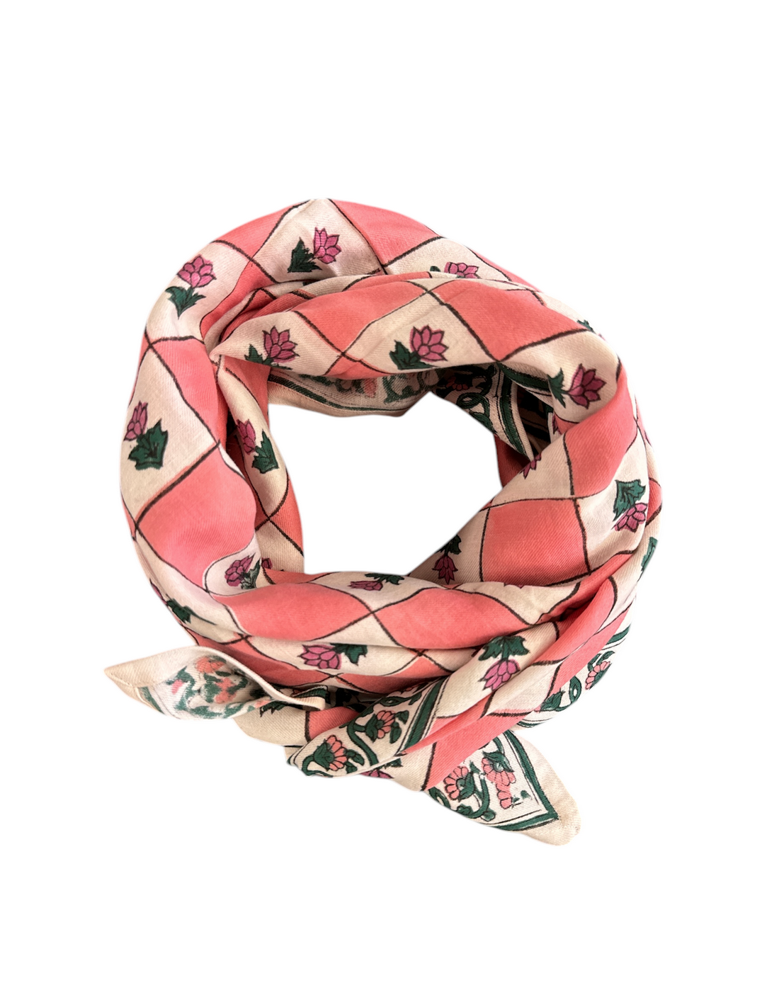 Ce foulard en coton est imprimé artisanalement en Inde.