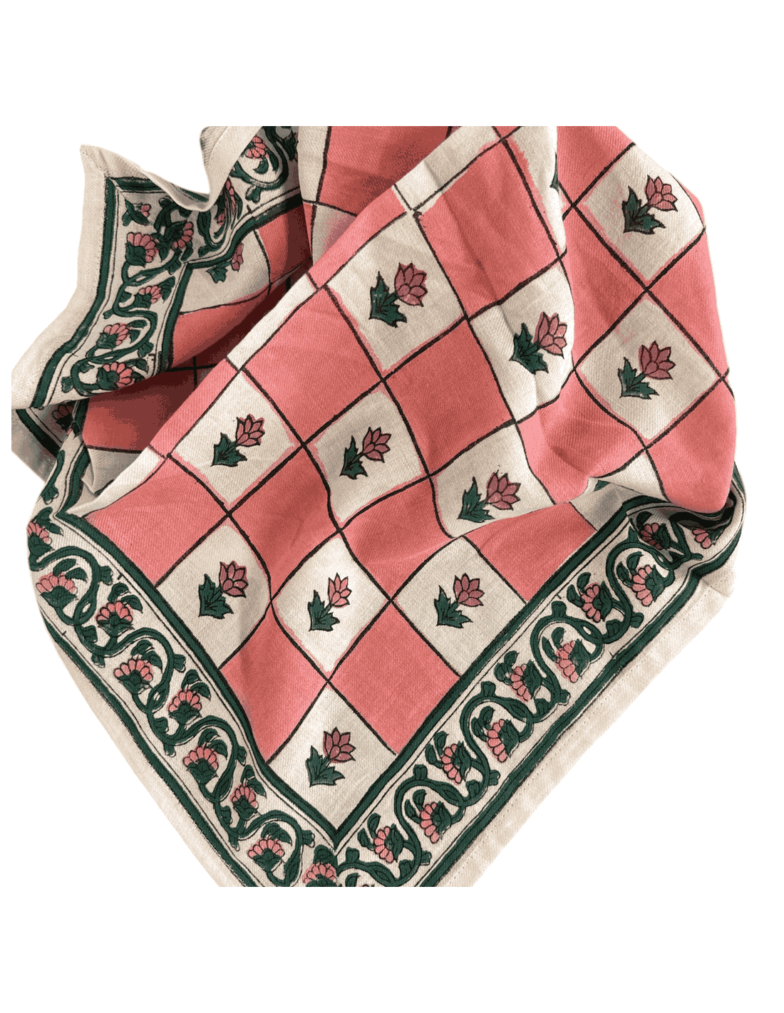 Motif imprimé grâce à la technique indienne du block-print, les couleurs sont réalisées à partir de pigments naturels.