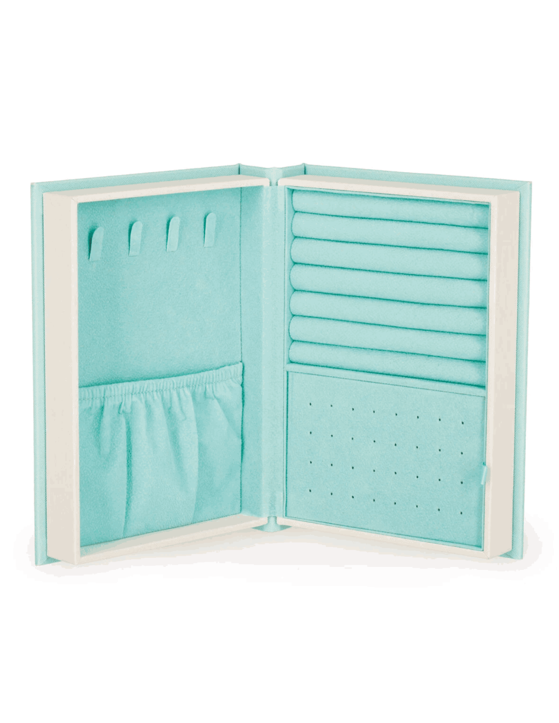 A l'intérieur retrouvez, 6 compartiments de rangement (couleur vert d'eau en suédine) : des rouleaux pour attacher vos bagues, des crochets pour suspendre vos bracelets et colliers, des trous pour fixer vos boucles d'oreilles, etc.... aucun bijou ne sera oublié.