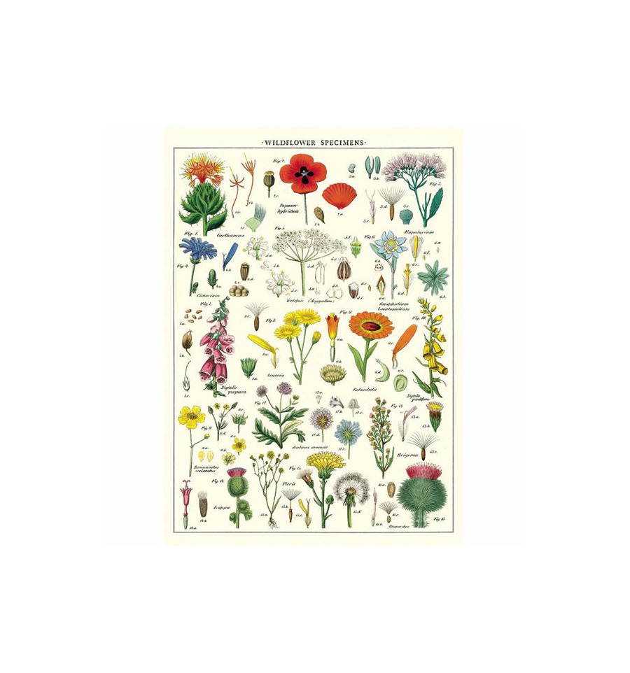 Affiche pédagogique rétro illustrée de différentes sortes de fleurs sauvages avec leurs noms respectifs en anglais.