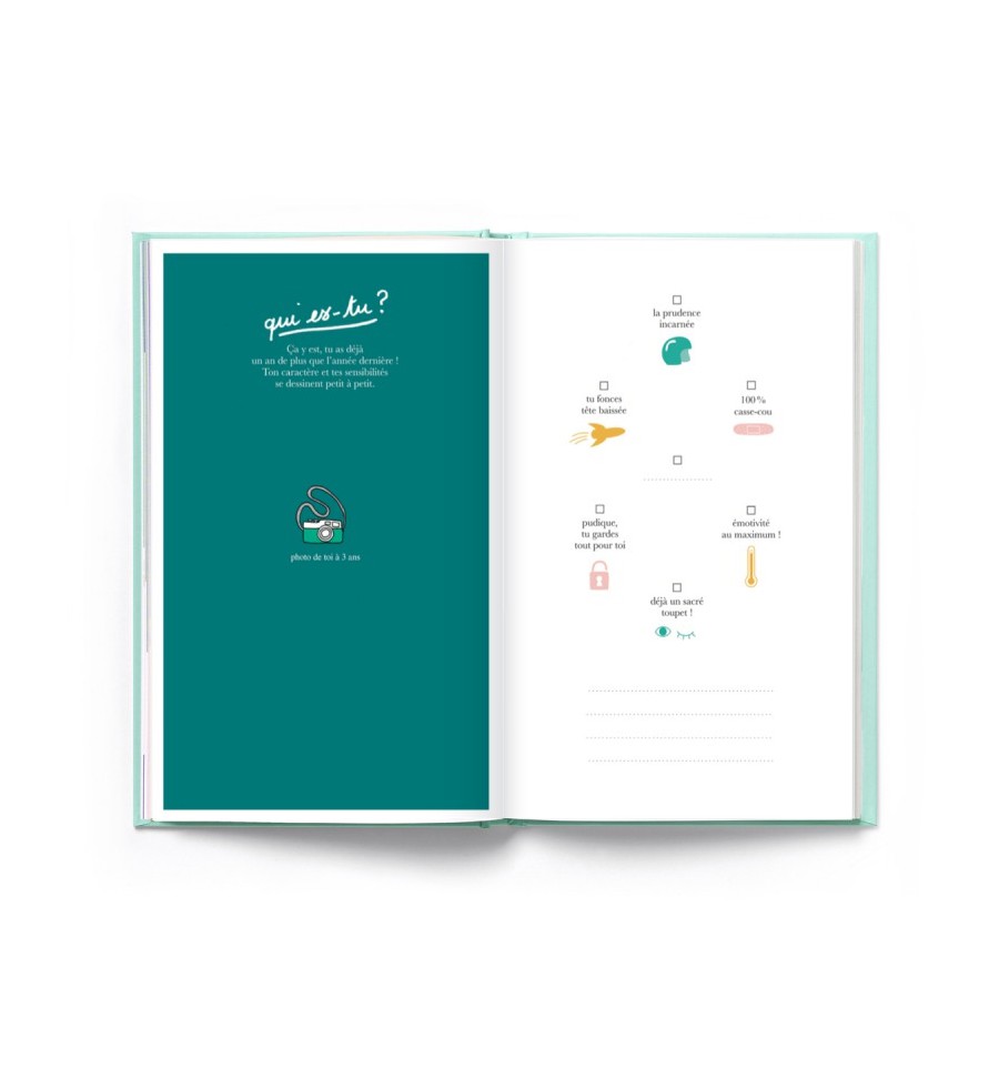 Vous avez aimé l’incontournable cahier de naissance ? Vous allez adorer ce cahier de souvenirs, pour ne rien oublier des 2 à 10 ans de votre enfant ! Chaque année, il vous suffira d’une petite heure pour consigner des souvenirs précieux sur son caractère, ses amis, sa vie à l’école, ses victoires et les grands évènements de l’année en cours !