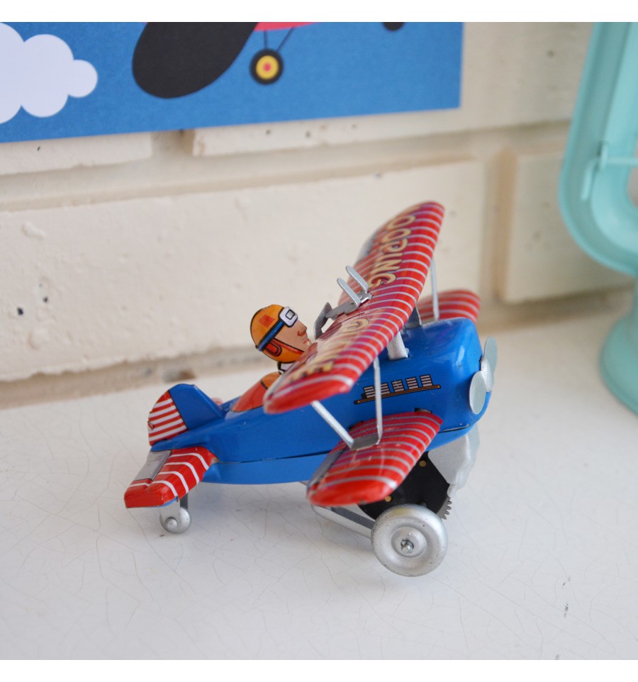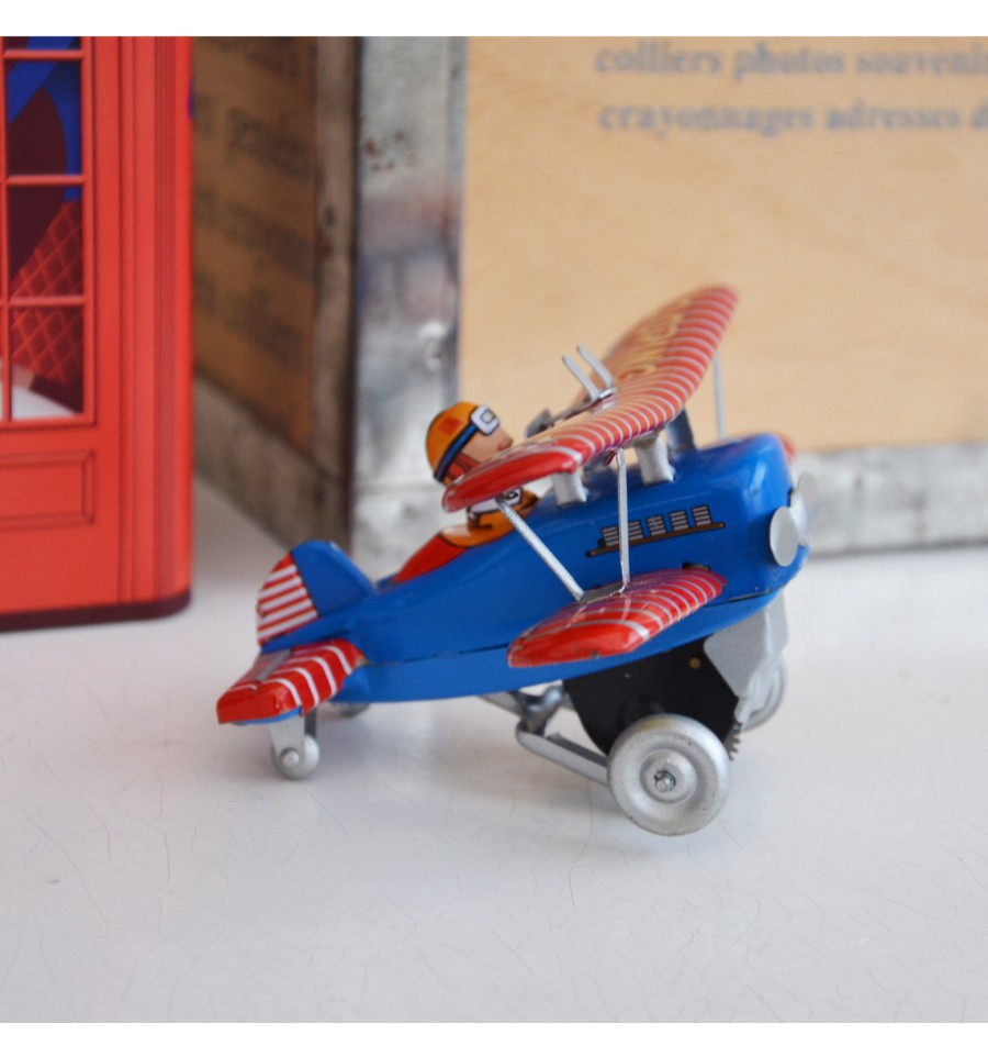 Avion en métal, rouge, bleu et jaune au look vintage. Emballé dans une jolie boite en carton très rétro !