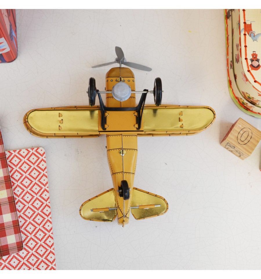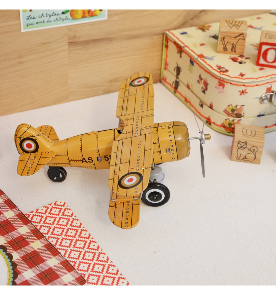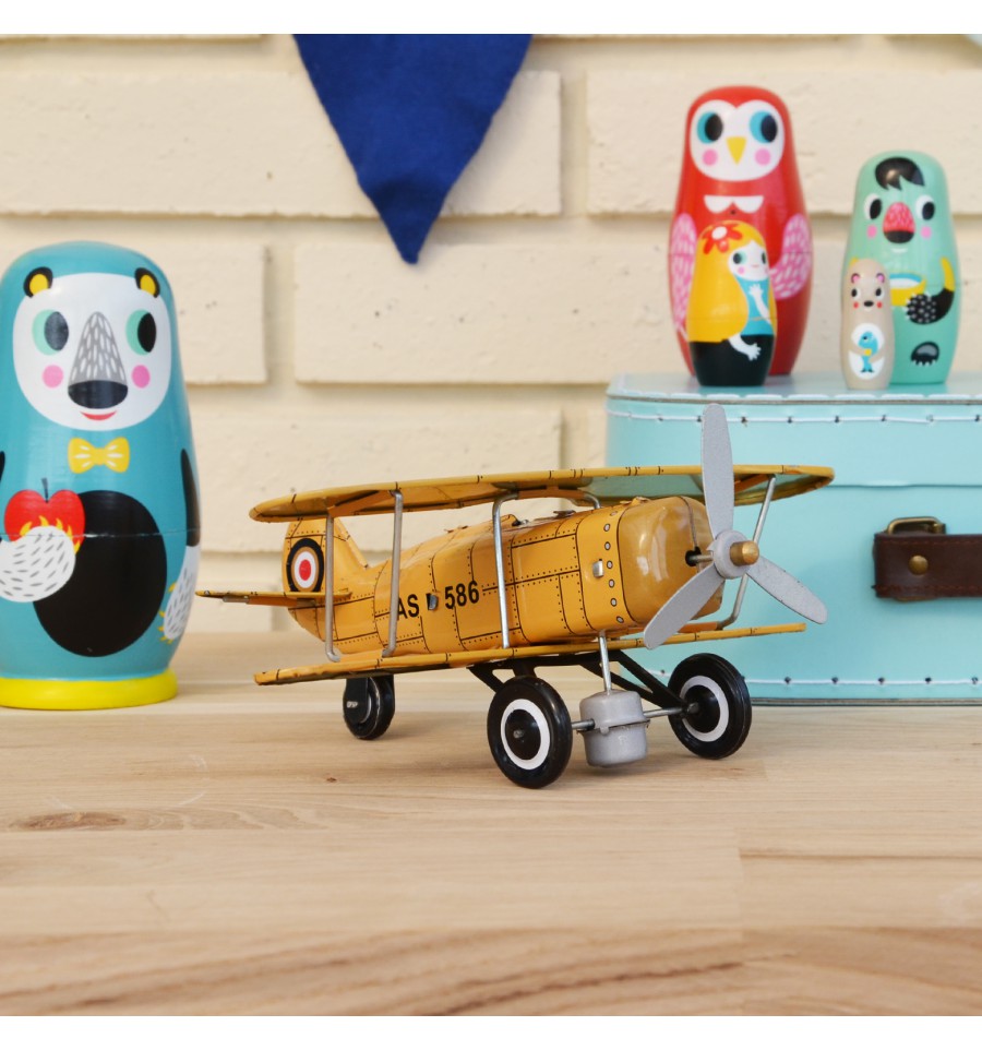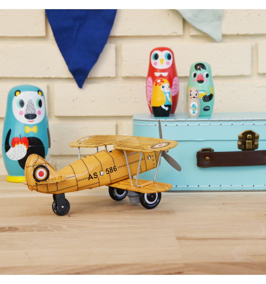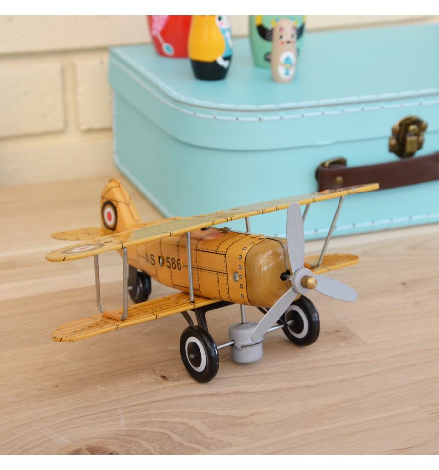 Avion en métal jaune au look vintage. Emballé dans une jolie boite en carton très rétro !