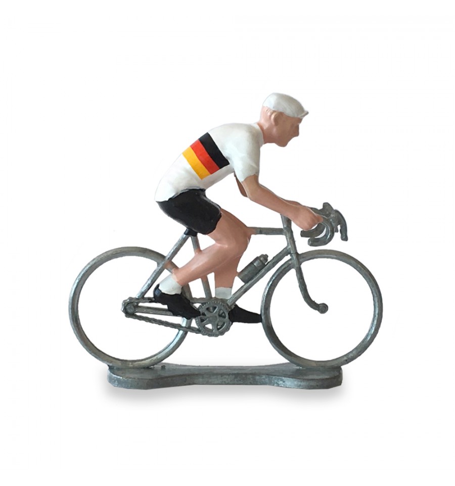 Cette figurine en métal représente un cycliste portant le maillot de l'Allemgne.