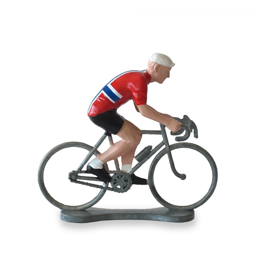 Cette figurine en métal représente un cycliste portant le maillot de la Norvège.