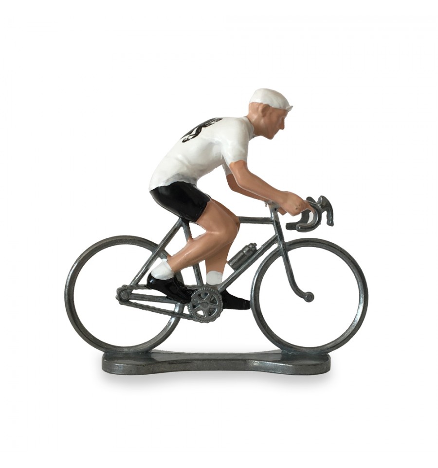Cette figurine en métal représente un cycliste portant le maillot de la Corse.