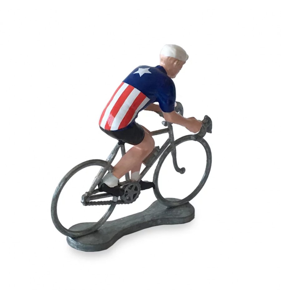 Cette figurine en métal représente un cycliste portant le maillot des Etats-Unis d'Amérique.