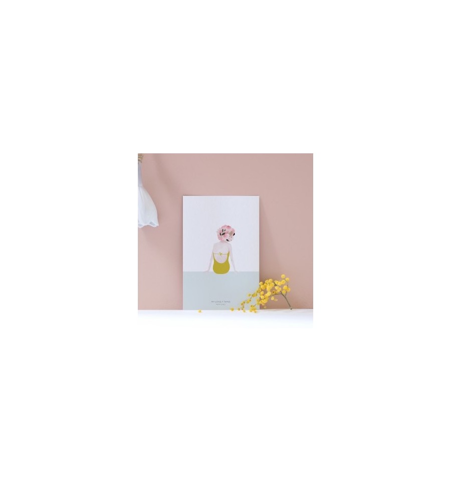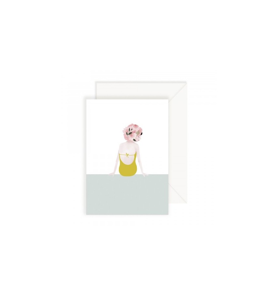 Cette jolie carte représente une femme de dos assise en maillot de bain vert, avec un bonnet rose avec des fleurs sur fond blanc.