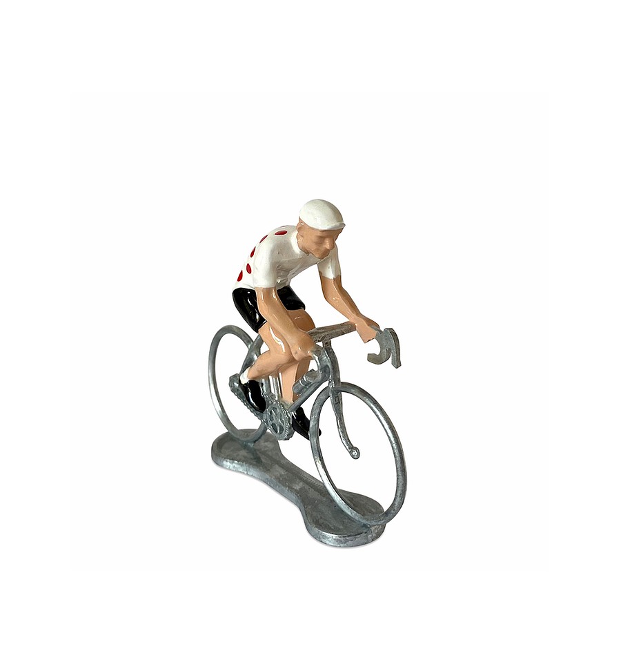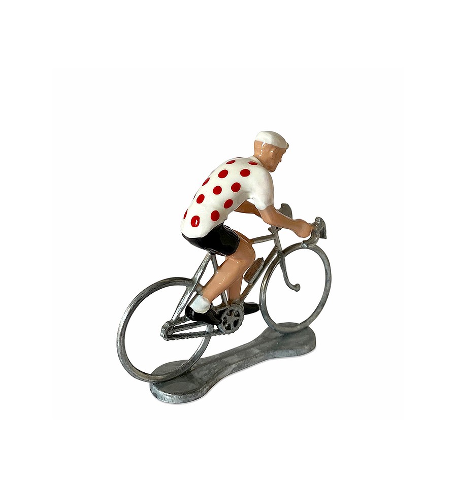 Cette figurine en métal représente un cycliste portant le maillot à pois du meilleur grimpeur du Tour de France.