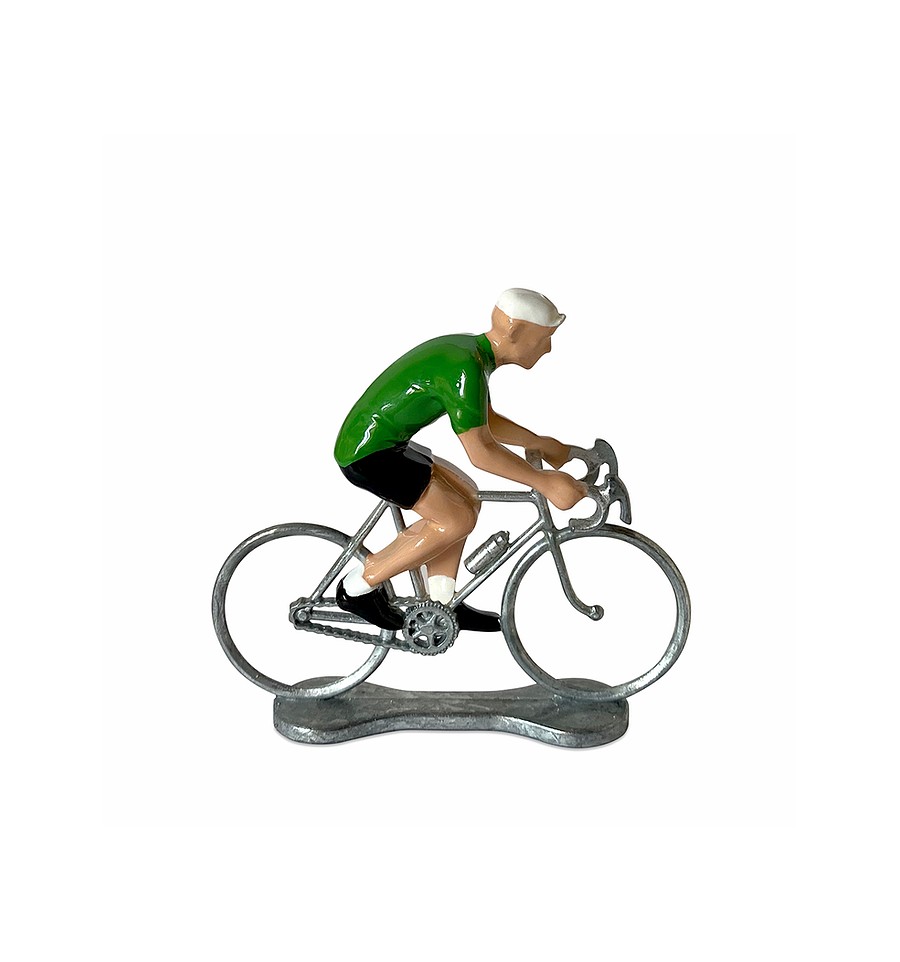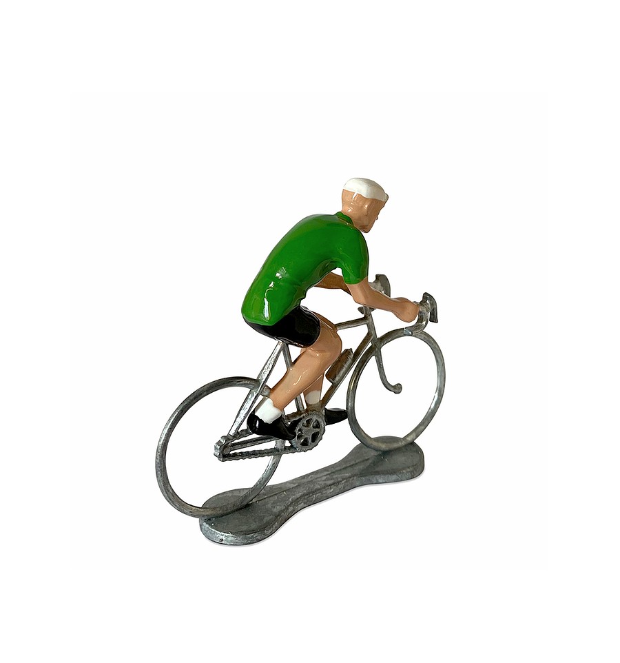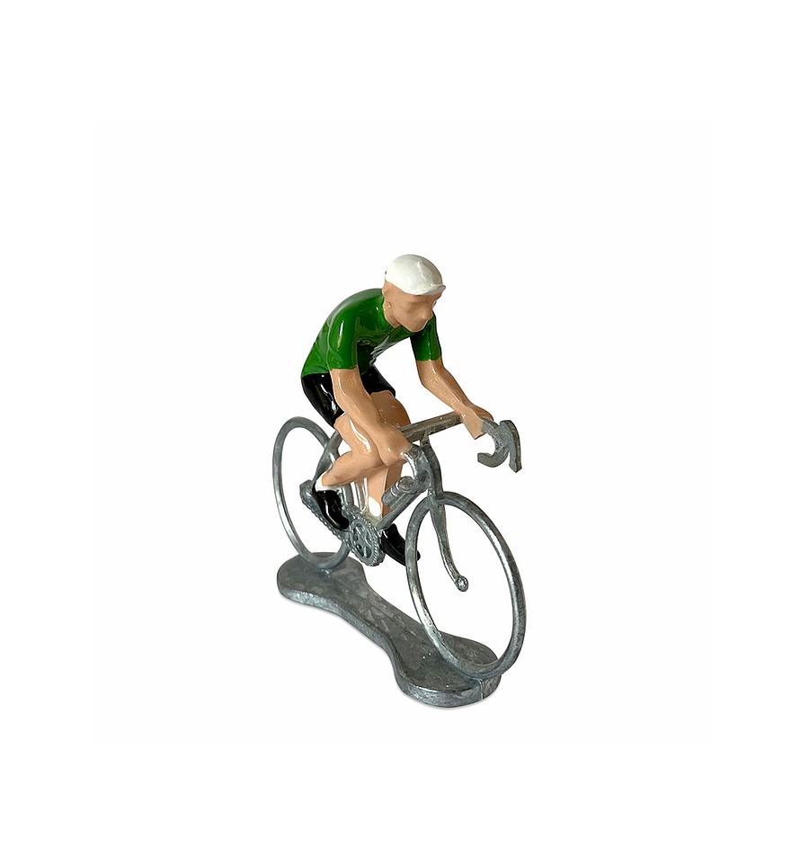 Cette figurine en métal représente un cycliste portant le maillot Vert du meilleur Sprinter du Tour de France.