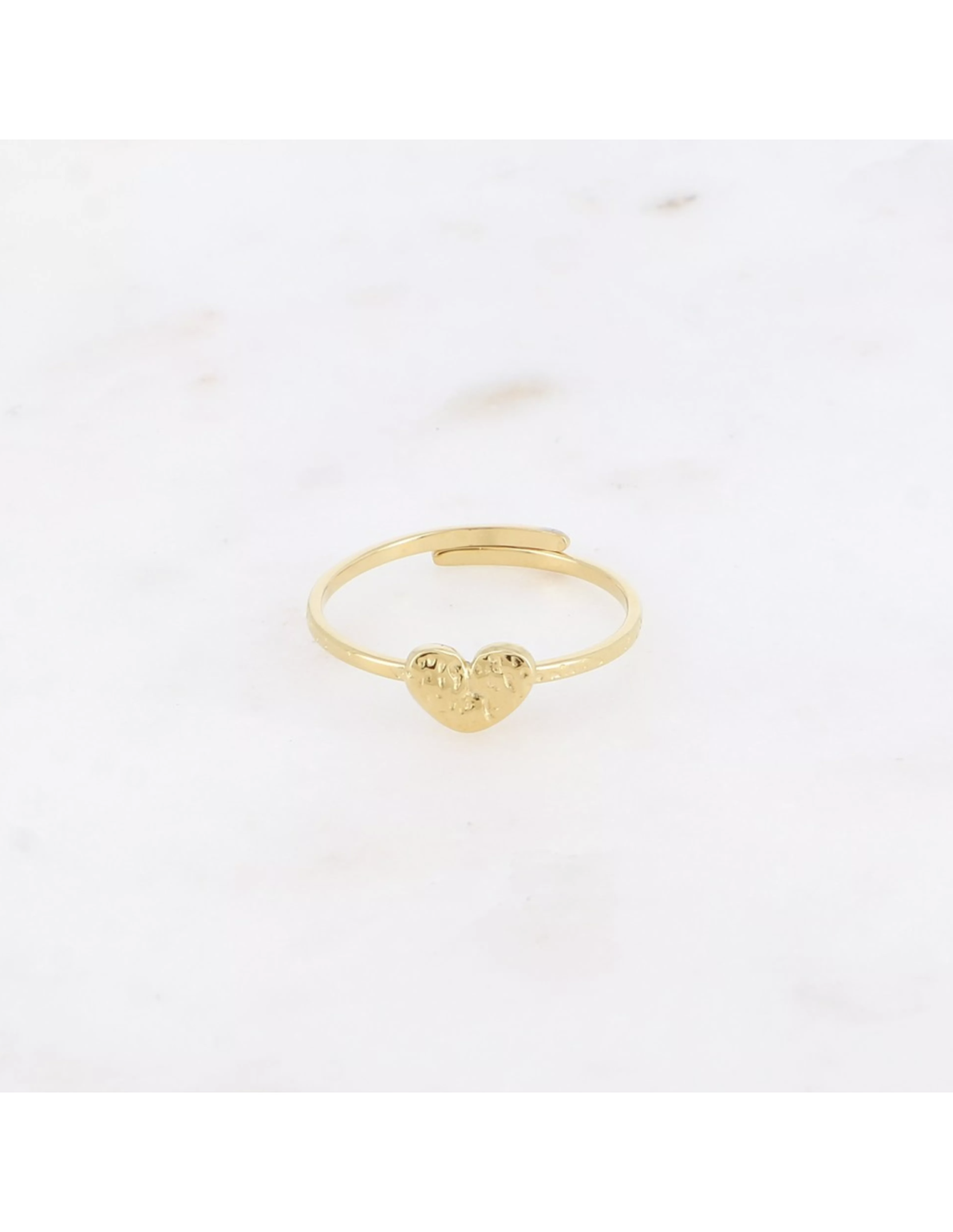 Cette bague fine et délicate est en acier inoxydable avec sur le dessus un petit coeur martelé.