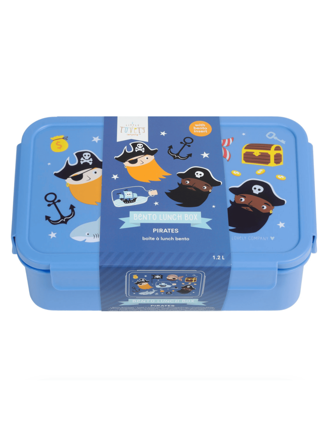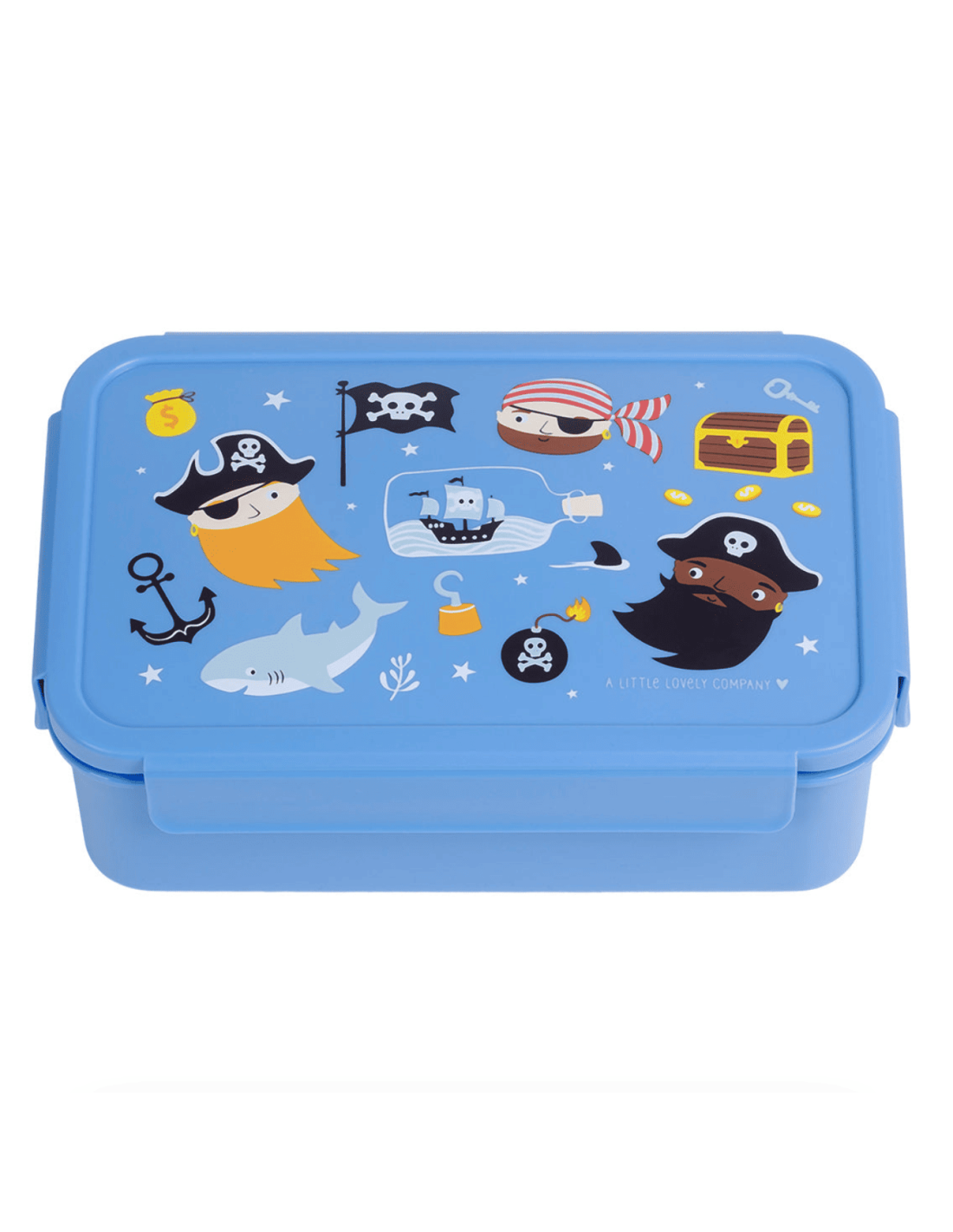 Cette boîte hermétique de la marque A little lovely company est bleu et recouverte de pirates ! Trois pirates sont réunit autour d'un coffre fort, d'un drapeau avec une tête de mort, d'un sac de pièce d'or, d'une ancre et encore d'autres détails effroyablement mignons. Ils sont prêts à vous accompagner pendant votre repas, même si vous n'avez pas au menu de Salmagundi, ils seront heureux !