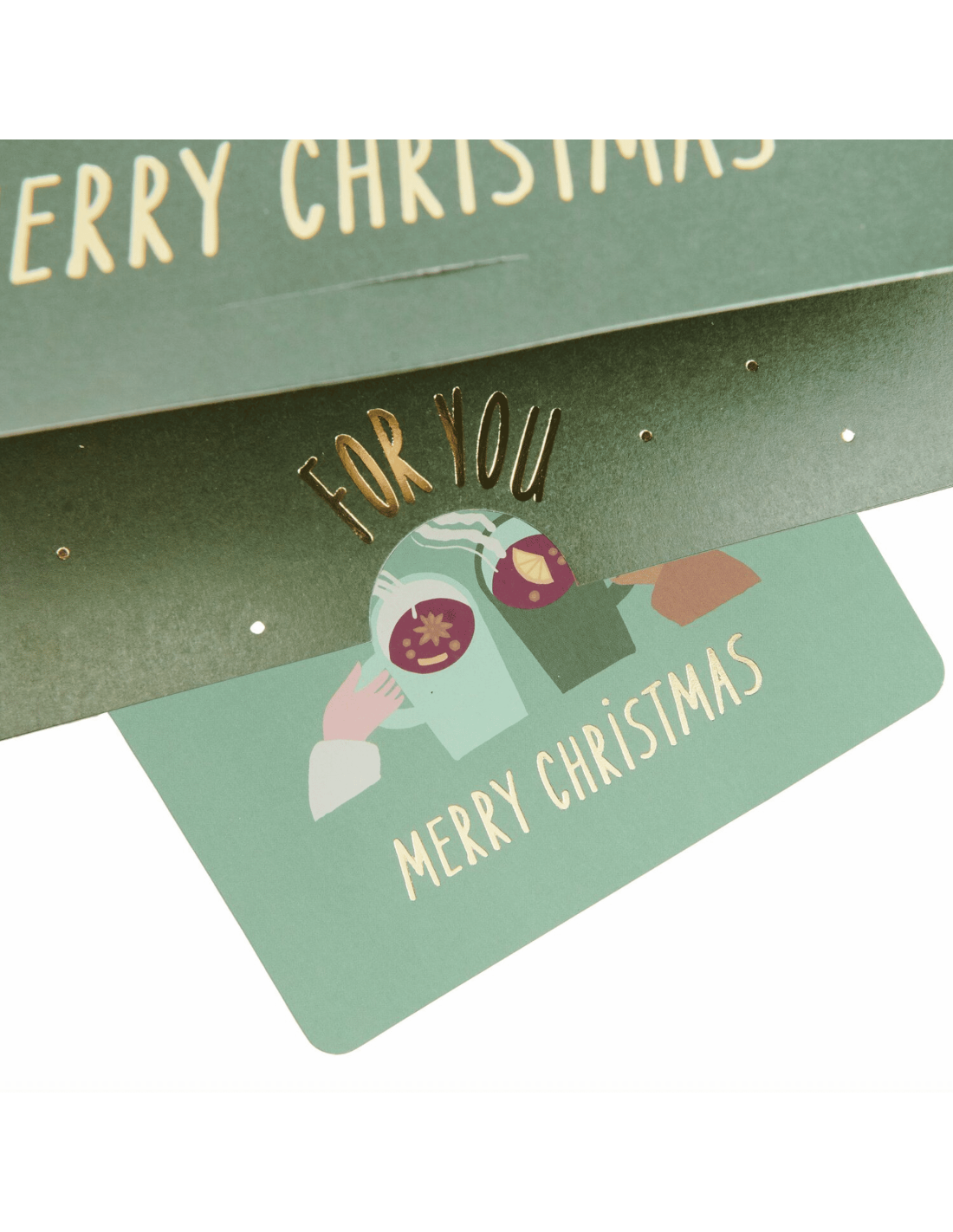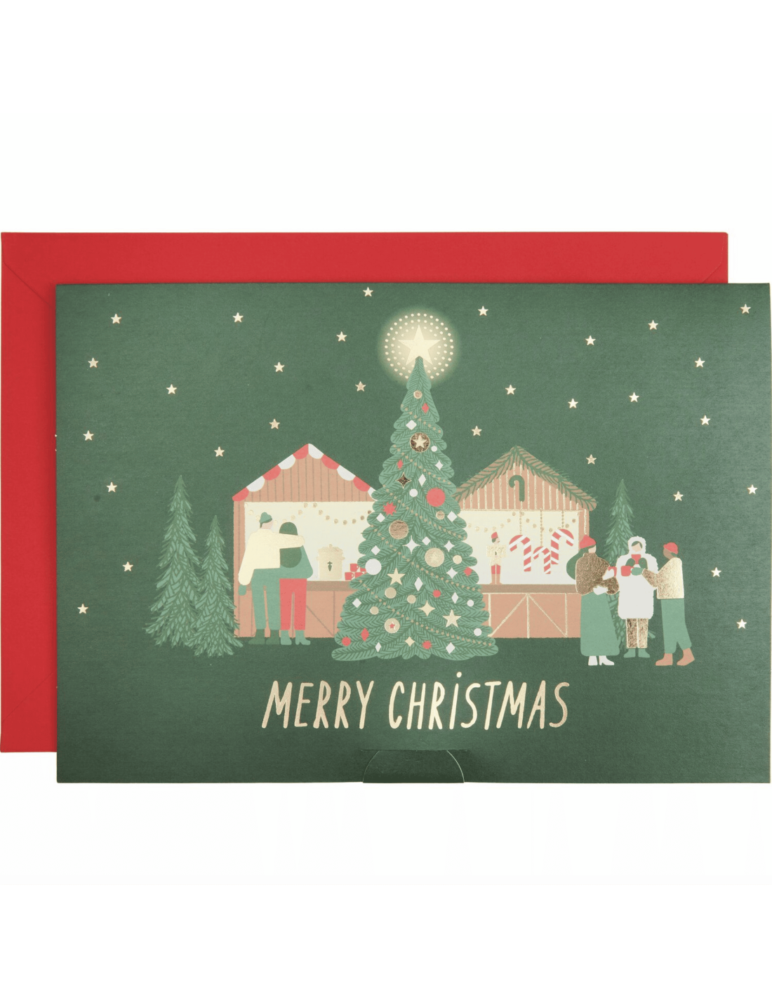 Si magnifique ! En l'ouvrant, elle laisse apparaitre un décor de marché de Noël, ambiance festive et chaleureuse assurée : de belles cabanes, des passants dégustant un vin chaud et de jolis détails dorés pour souligner le tout. En bas de la carte, on peut lire le message "Merry Christmas" = Joyeux Noël.
