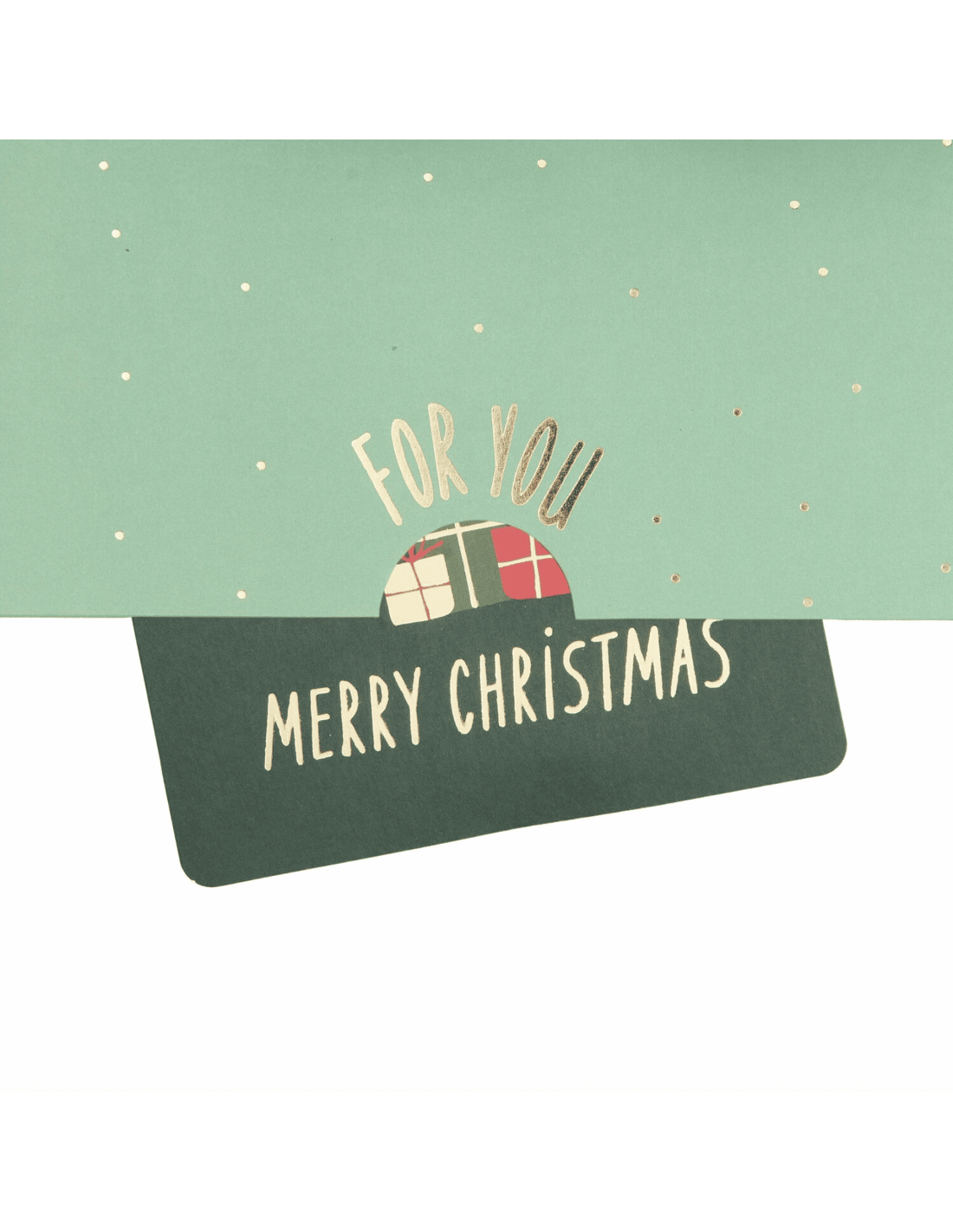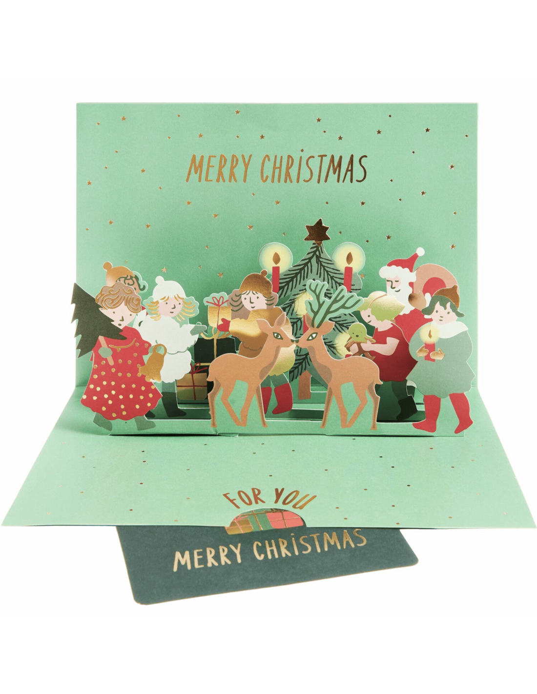 Si magnifique ! En l'ouvrant, elle laisse apparaitre un décor autour de Noël, ambiance festive et chaleureuse assurée : 6 personnages réunies autour d'un sapin de Noël avec le père Noël qui s'y glisse avec son gros sac rempli de cadeaux. Au milieu, deux rennes se font un ptit bisou sur le bout du museau, il y a également de jolis détails dorés pour souligner le tout. En bas de la carte, on peut lire le message "Merry Christmas" = Joyeux Noël.