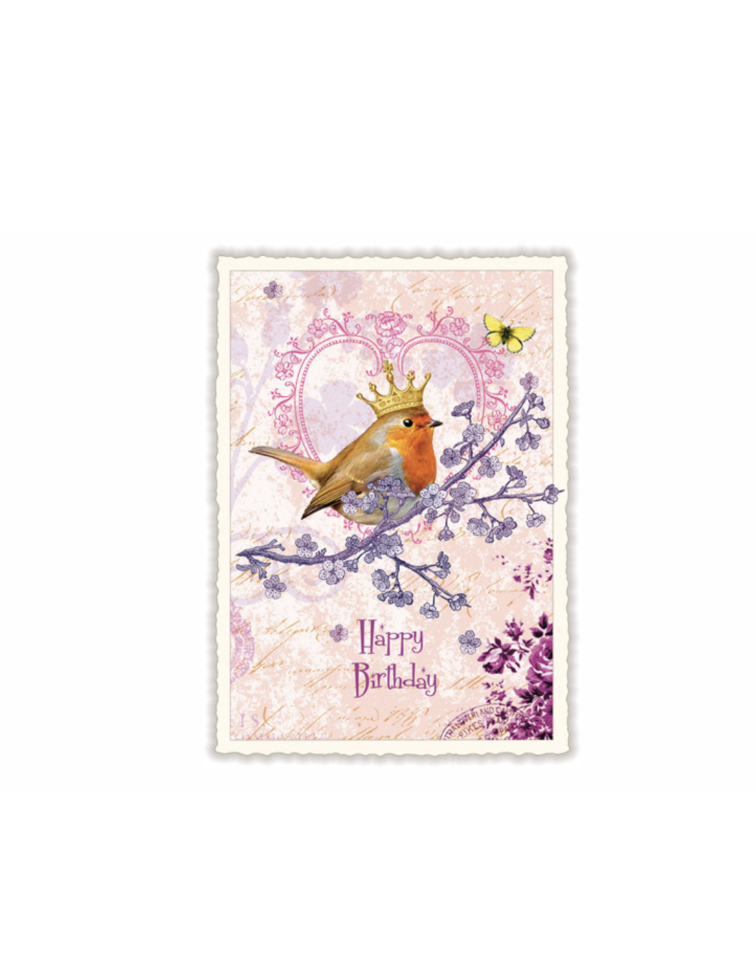 Sur la carte retrouvez le roi du jardin : le Rouge Gorge. Couronné de doré, entouré d'un coeur rose et posé sur une branche de cerisier fleuri, cet oiseau majestueusement minuscule se joint à vous pour souhaitez un "Happy Birthday". Les paillettes viennent sublimer cette carte vraiment trop jolie.