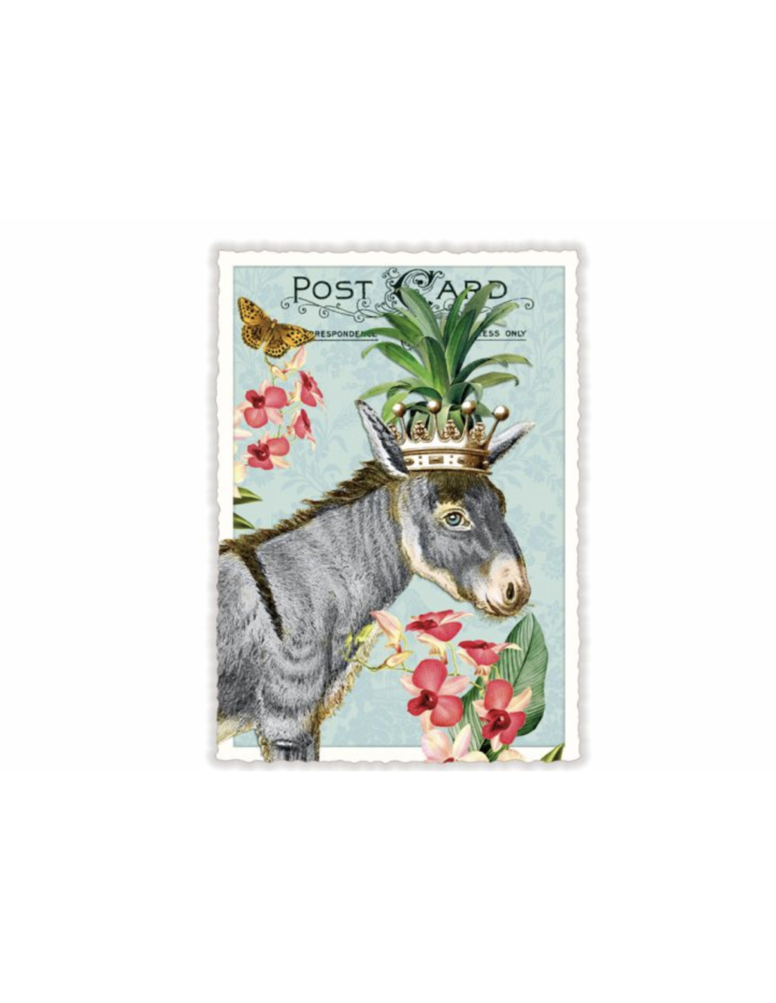 Sur la carte retrouvez, un âne magnifique chapeauté d'une couronne laissant dépasser une coiffe d'ananas. Oui oui vous avez bien lu ! Sur un fond délicatement bleu à paillettes, l'âne aux yeux bleus est entouré d'orchidées rouges et d'un joli papillon jaune.