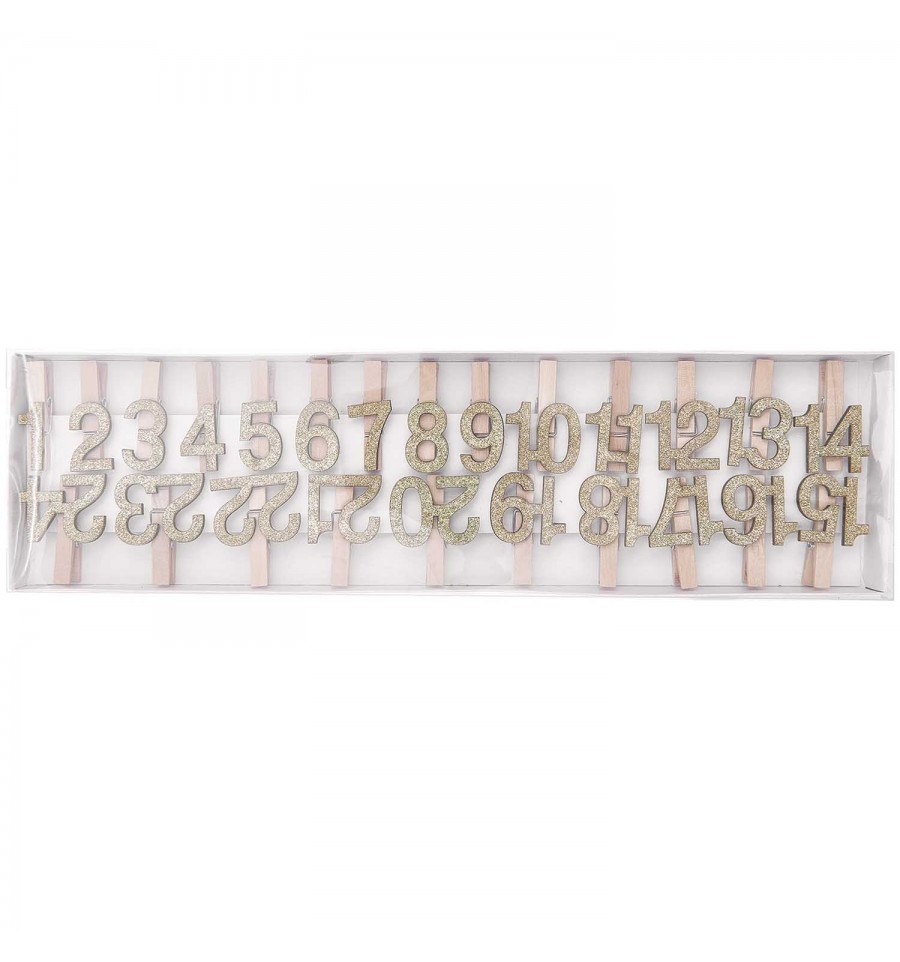 Rico Design a imaginé des pinces à linge en bois numérotées pailletées dorées, pour réaliser de jolies décos ou embellir vos projets de scrapbooking ! Elles seront parfaites pour fermer les pochettes de votre calendrier de l'avent.