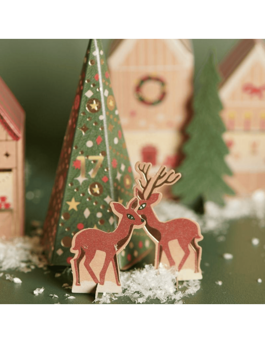 24 boites en forme de maisons et sapins de Noël à monter et à remplir pour confectionner un calendrier de l'avent DIY.