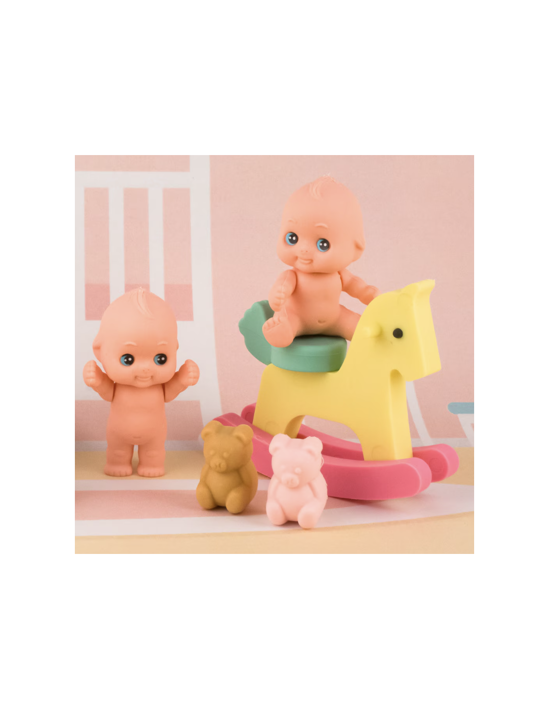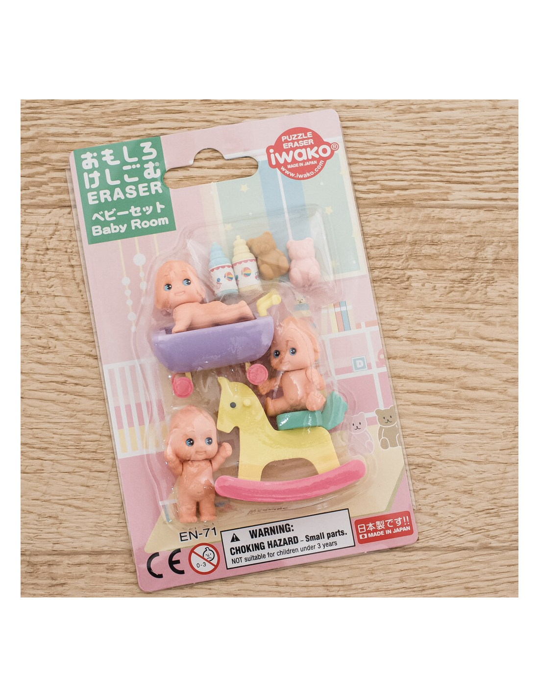 Ce pack est constitué de 7 éléments différents, ce sont des gommes japonaises en forme de bébé et d'accessoires. Trop chou !! trois petits bébés qui ont envie de passer un super moment dans leur chambre, on adore !!