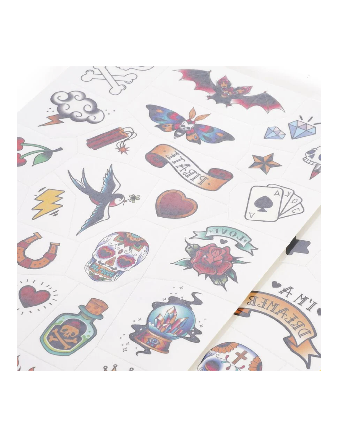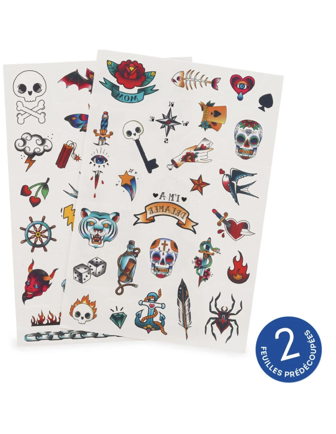 Dans cette pochette retrouvez deux planches de tatouages tous différents (plus de 50 tatouages) testés dermatologiquement.