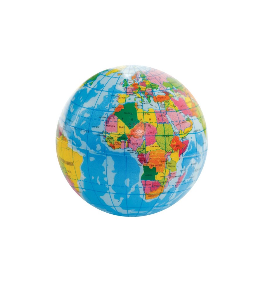 Balle en mousse représentant la planète Terre. Pays délimités par des couleurs différentes.