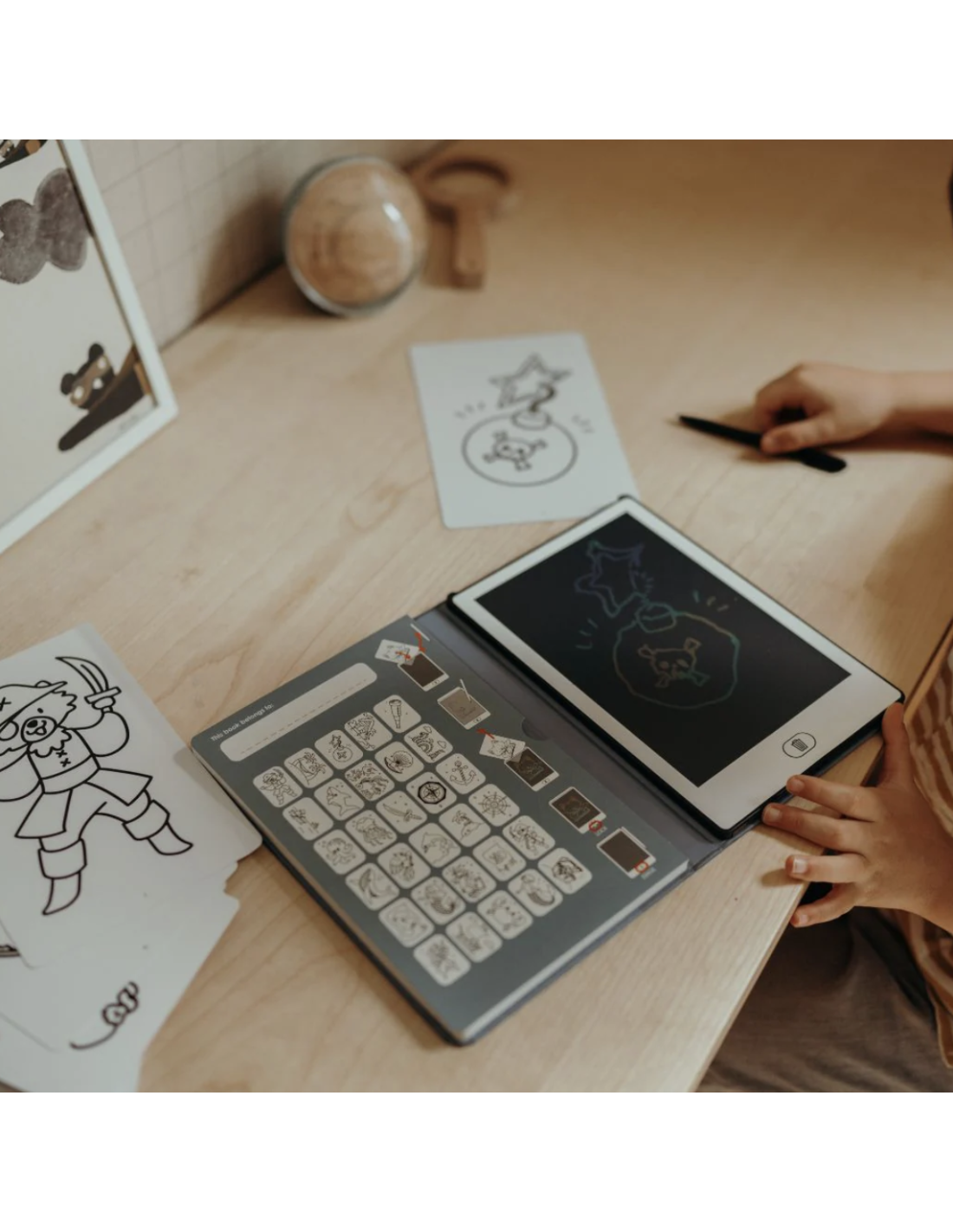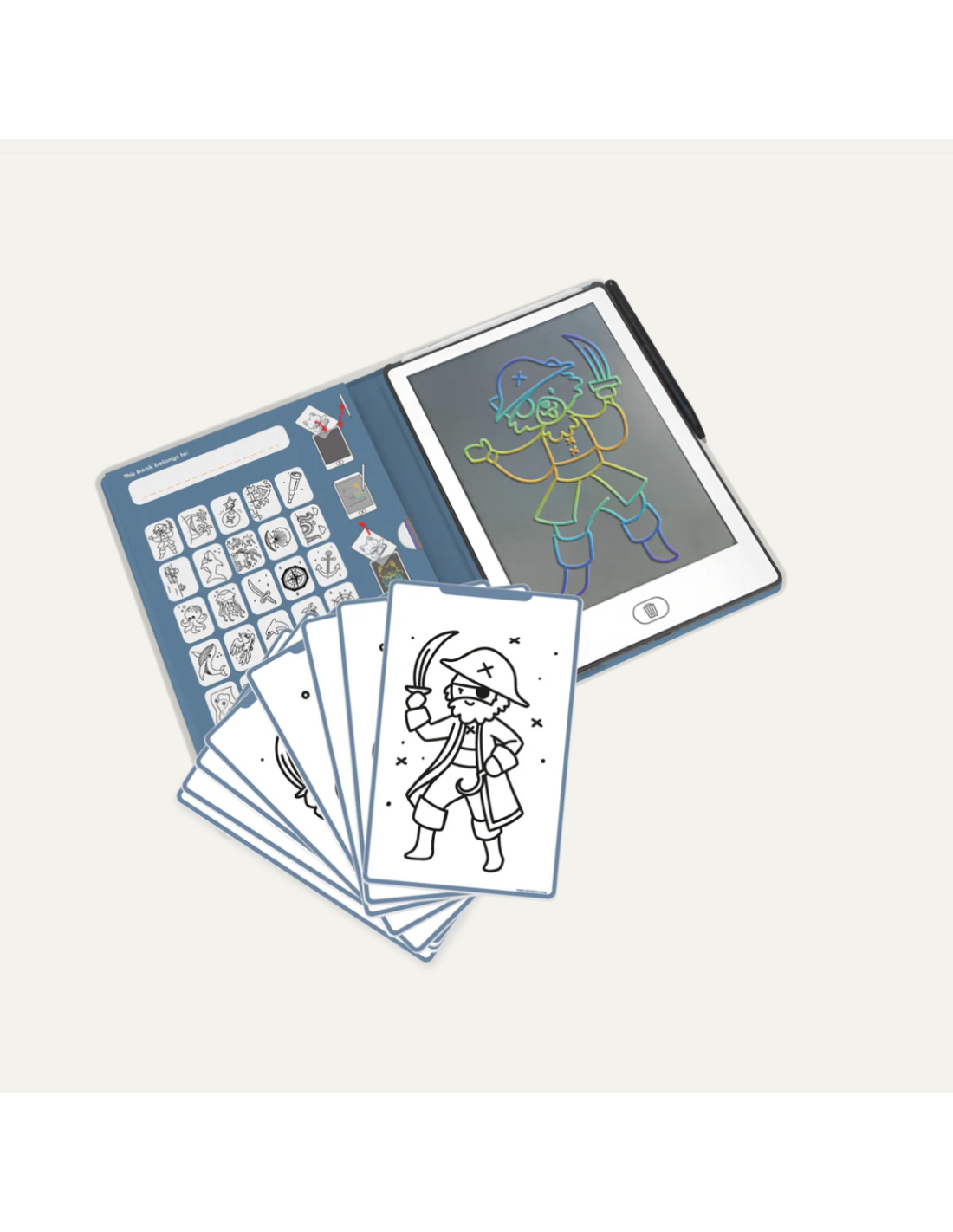 Découvrez un écran LCD et une pochette protégeant une trentaine d'illustrations sur le thème des pirates et de l'océan à décalquer.
