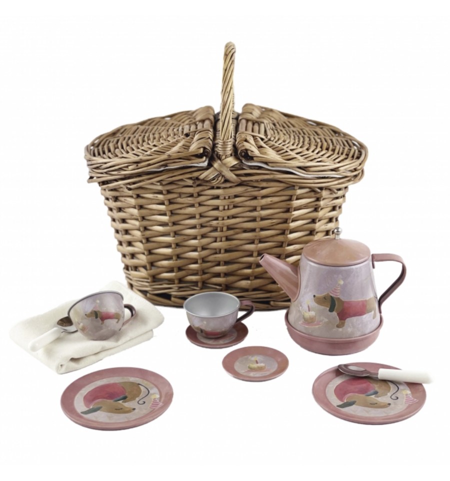 Superbe panier à double rabat en osier crée par Egmont Toys, il renferme un service à thé avec de chien mignon à chapeau rayé qui porte un tee shirt rouge.