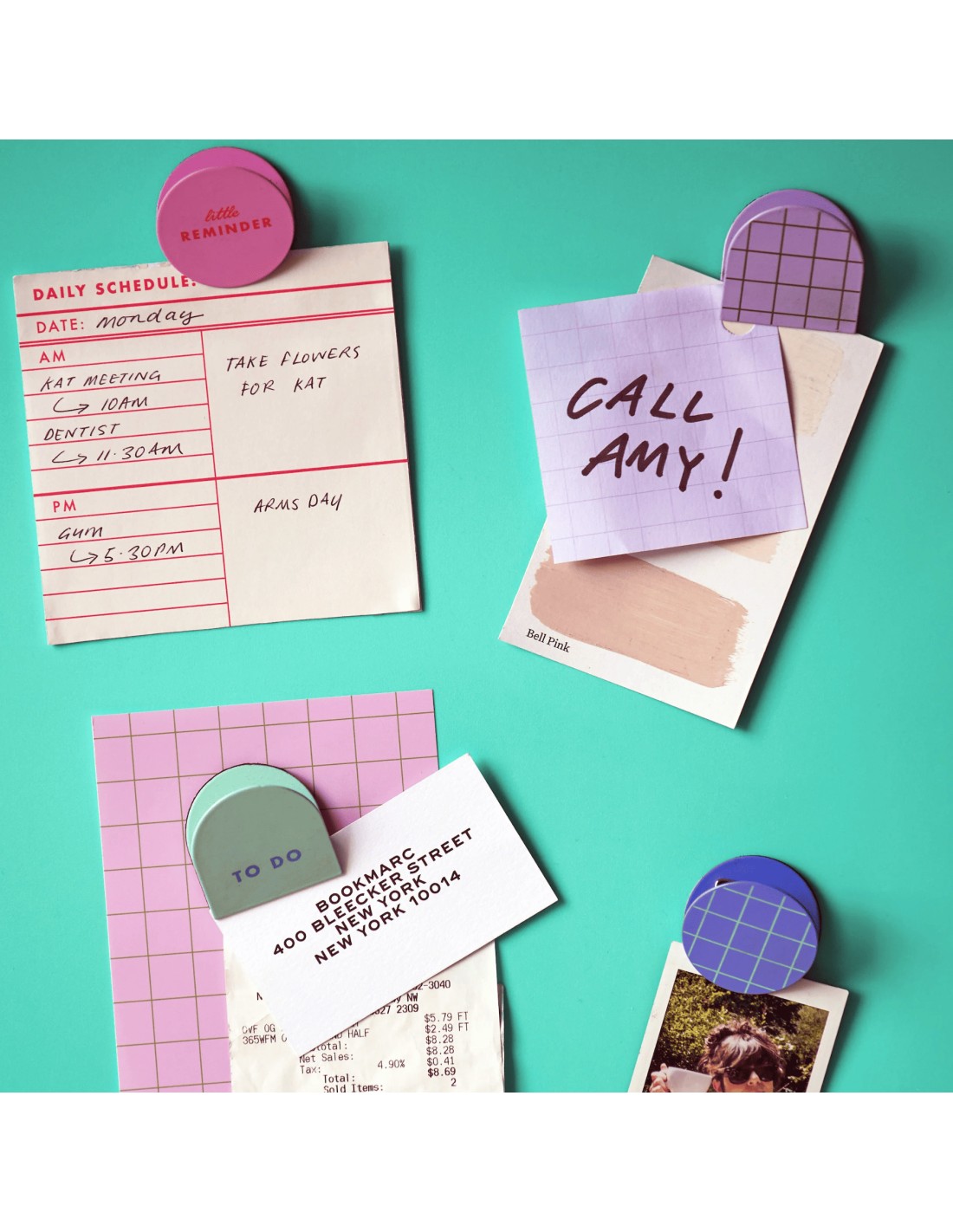 Quatre clips différents : un rond rose (little reminder), un rond a carreaux bleu et vert, une pince à carreaux violet et blanc et enfin un clip turquoise (to do).