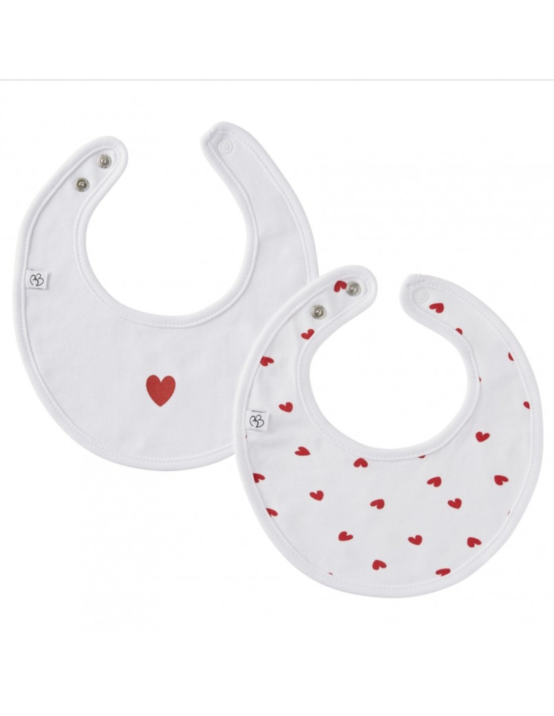 Le premier bavoir est blanc avec coeur rouge solitaire tandis que le deuxième est tapissé de coeurs rouges sur fond blanc.
