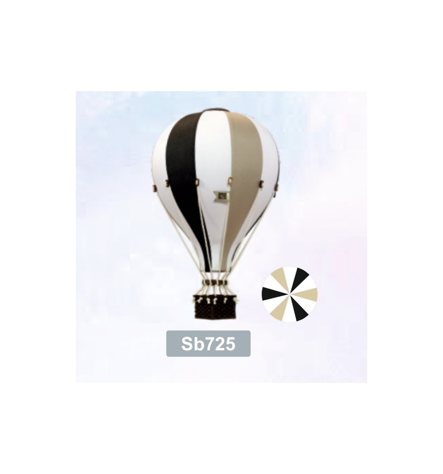 Matériaux : Panier en bois teinté. Tube de latex à l'intérieur du ballon. Tissus en polyester, suspension en fil de pêche.