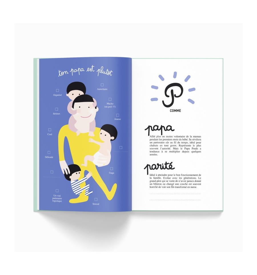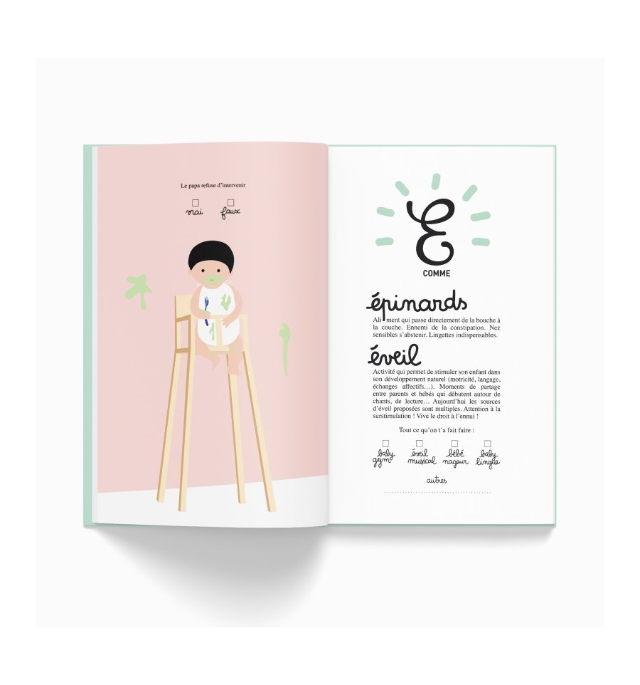 Moderne, tendre et plein d’humour, ce cahier passe au crible les préoccupations des jeunes parents d'aujourd'hui : de l’envie d’être une «super maman qui assure» au besoin vital de «faire ses nuits»... Ils pourront y collecter anecdotes et photos avec une bonne dose d’autodérision.